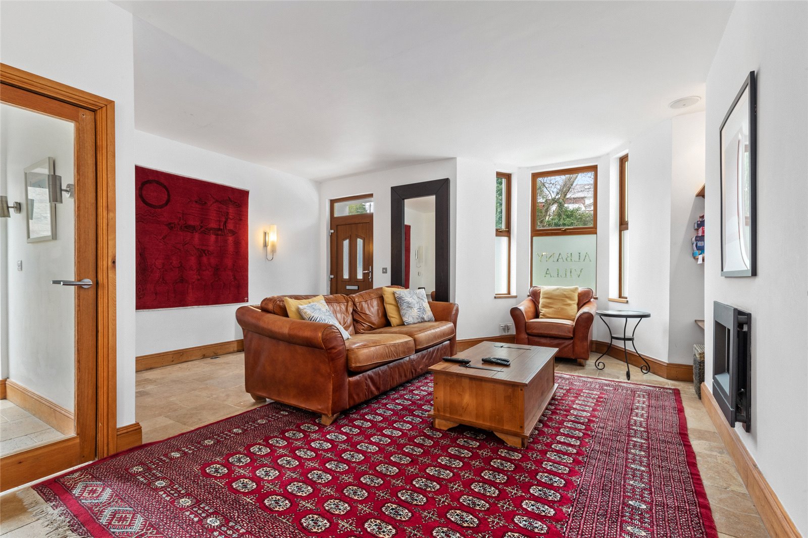 uPVC double glazed wood effect door to fore with glazed transom window over, bay window to fore with "Albany Villa" feature glazing, wall lights, thermostat control for central heating, telephone point, two wall mounted gas fire, recess housing tv point with cupboard under for storage, shelved alcove with spotlight, ceiling mounted speakers, opening to and step down to mezzanine.