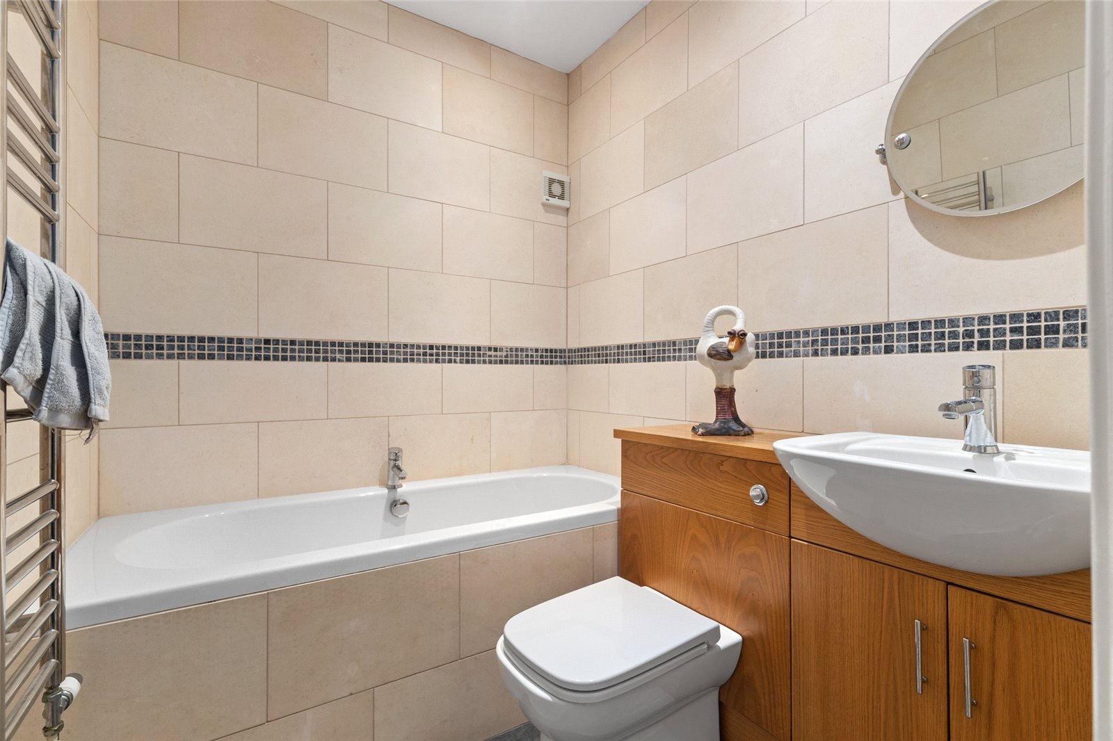 Fully tiled walls and floor with attractive mosaic effect tiling, panelled bath with mixer tap, wc and wash hand basin in stylish wooden back to wall unit with storage under, ladder style radiator, extractor, wall mounted mirror.