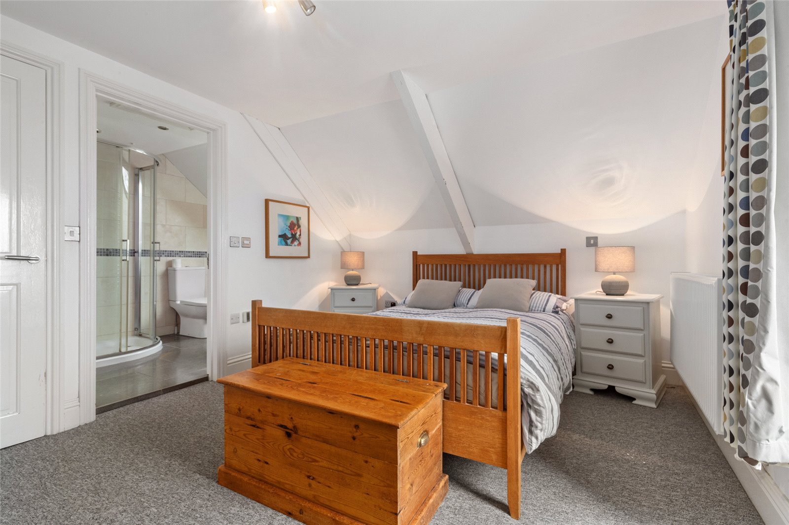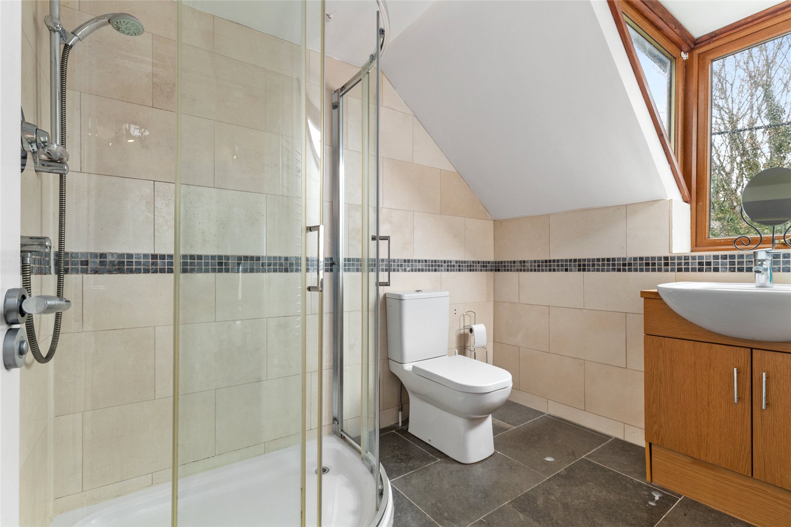 uPVC double glazed dormer window to front, fully tiled walls and floor with attractive mosaic effect tiling, wc, wash hand basin set in wooden vanity unit with storage under, wall mounted mirror, extractor, inset ceiling lights, ladder effect towel radiator, glazed shower cubicle with mains shower.