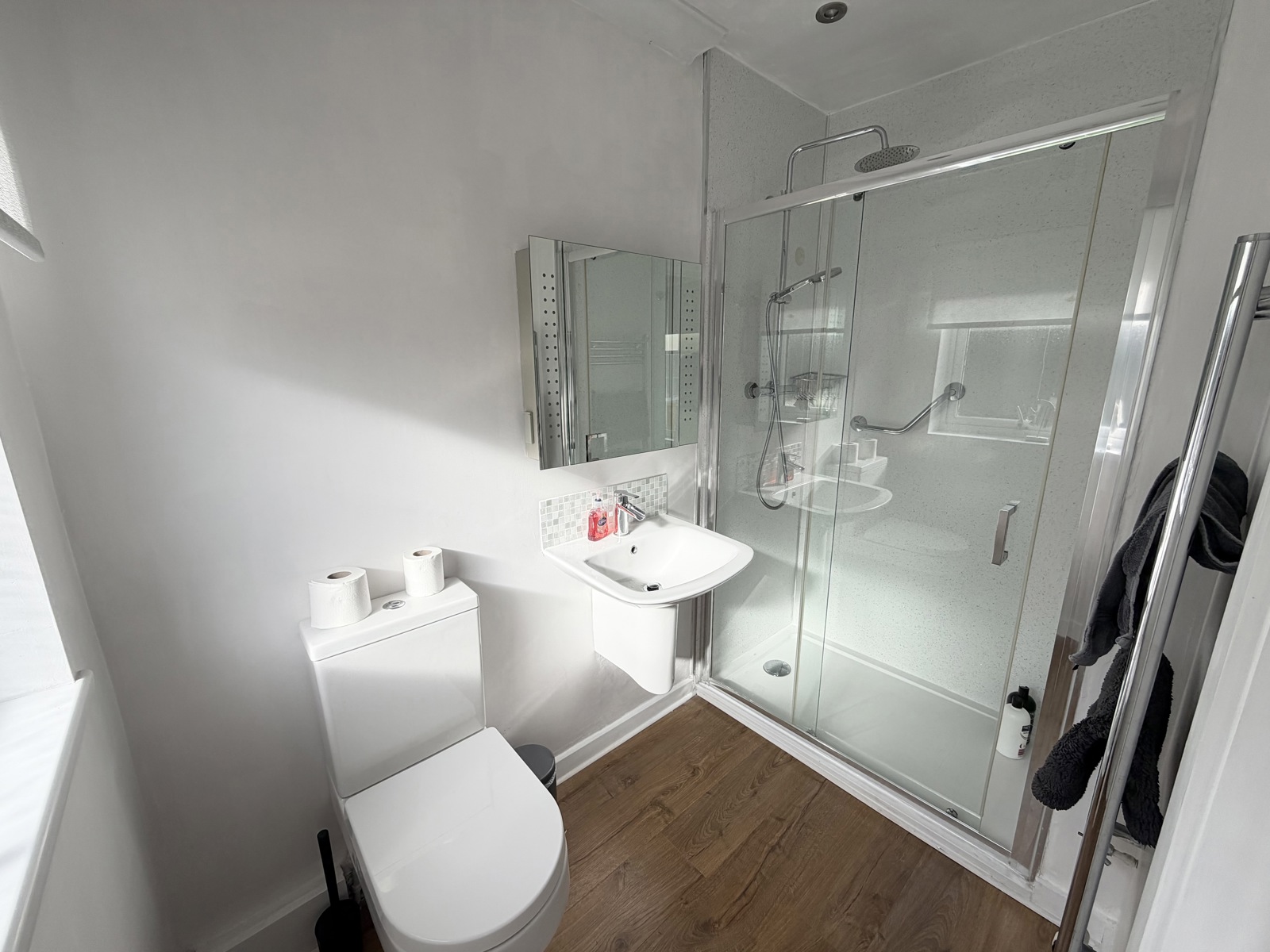 Laminate flooring, low-level WC, wash hand basin, heated towel rail, and a shower enclosure with overhead waterfall shower. Double glazed UPVC window overlooking the rear aspect.