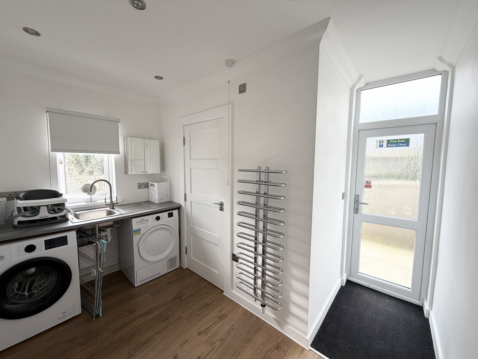 Laminate flooring throughout, with space for a washing machine and tumble dryer. Stainless steel sink with mixer tap, heated towel rail, and a double glazed UPVC window overlooking the rear aspect. Partially glazed obscured UPVC door providing side access.