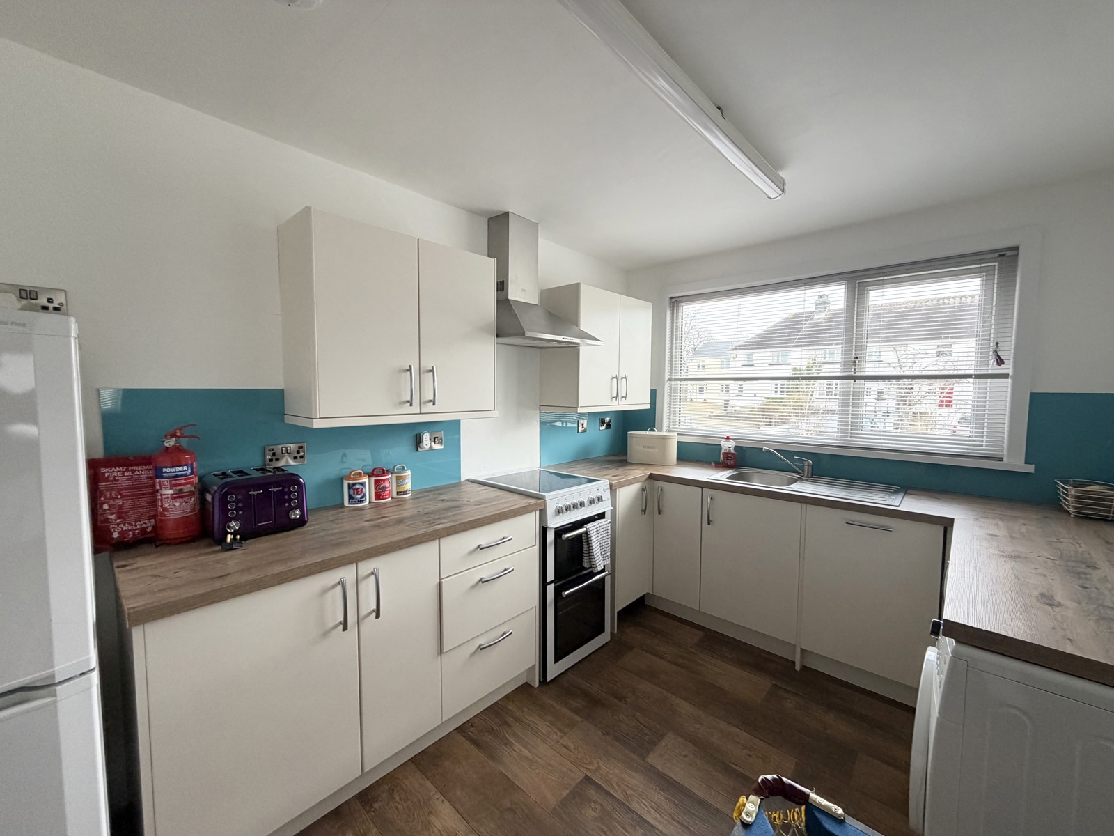 This kitchen offers a range of wall and base-mounted units with vinyl worktops and a turquoise splashback. It includes an integrated dishwasher, stainless steel sink, extractor fan, and space for a washing machine, fridge, and oven. Laminate flooring runs throughout, and a double-glazed UPVC window to the front aspect provides natural light.