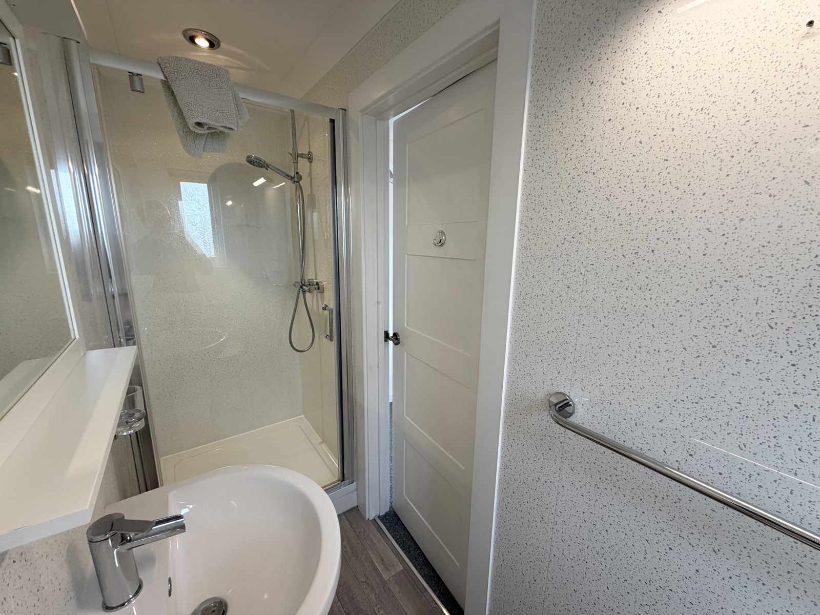 Double glazed UPVC window overlooking the side aspect, vinyl flooring throughout, and walls partially panelled with aqua panelling. Comprising a shower enclosure with waterfall shower head, wash hand basin, WC, and heated towel rail.