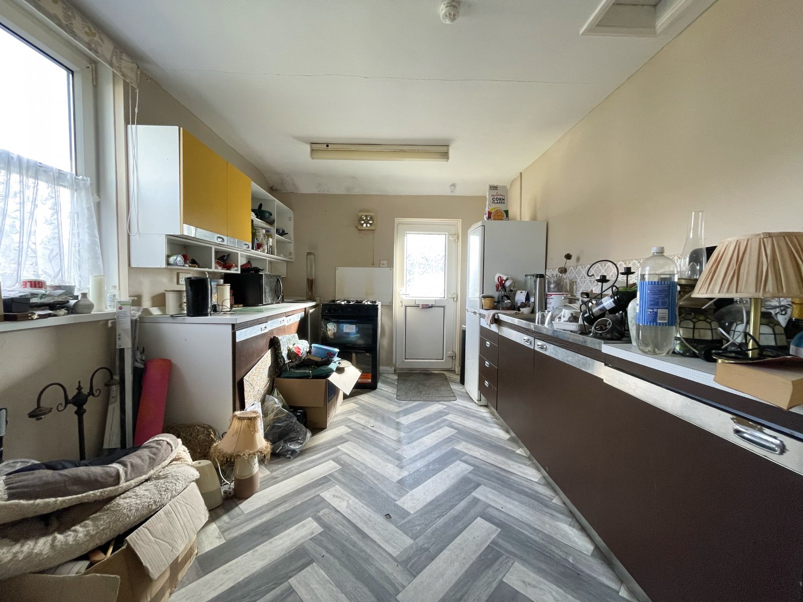 The property's second kitchen; comprising briefly of base kitchen units with integrated stainless steel sink, laminate flooring, half-tiled walls, ceiling light, radiator, front-facing double-glazed window and rear double-glazed Velux window.