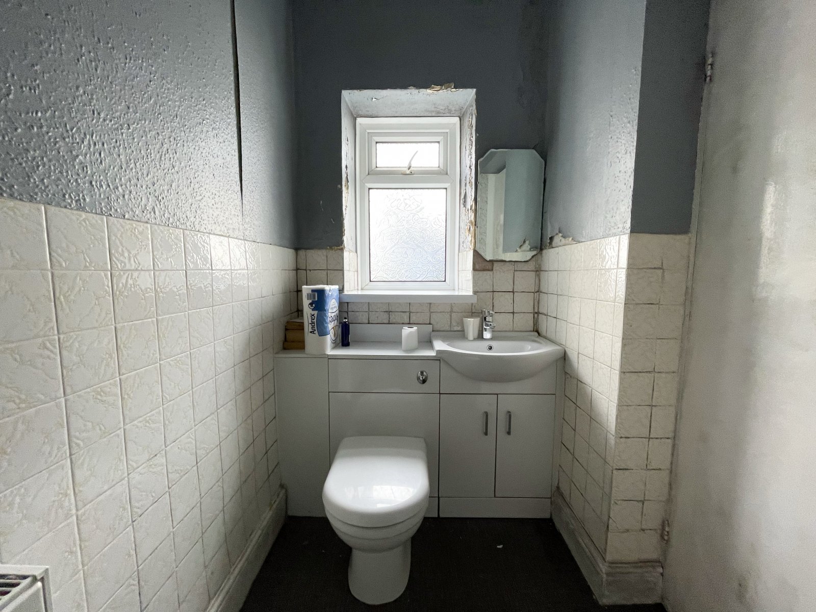 First floor bathroom, benefitting from bath, wash hand basin, w/c, carpeted flooring, half-tiled walls, ceiling light, double-glazed window to fore.