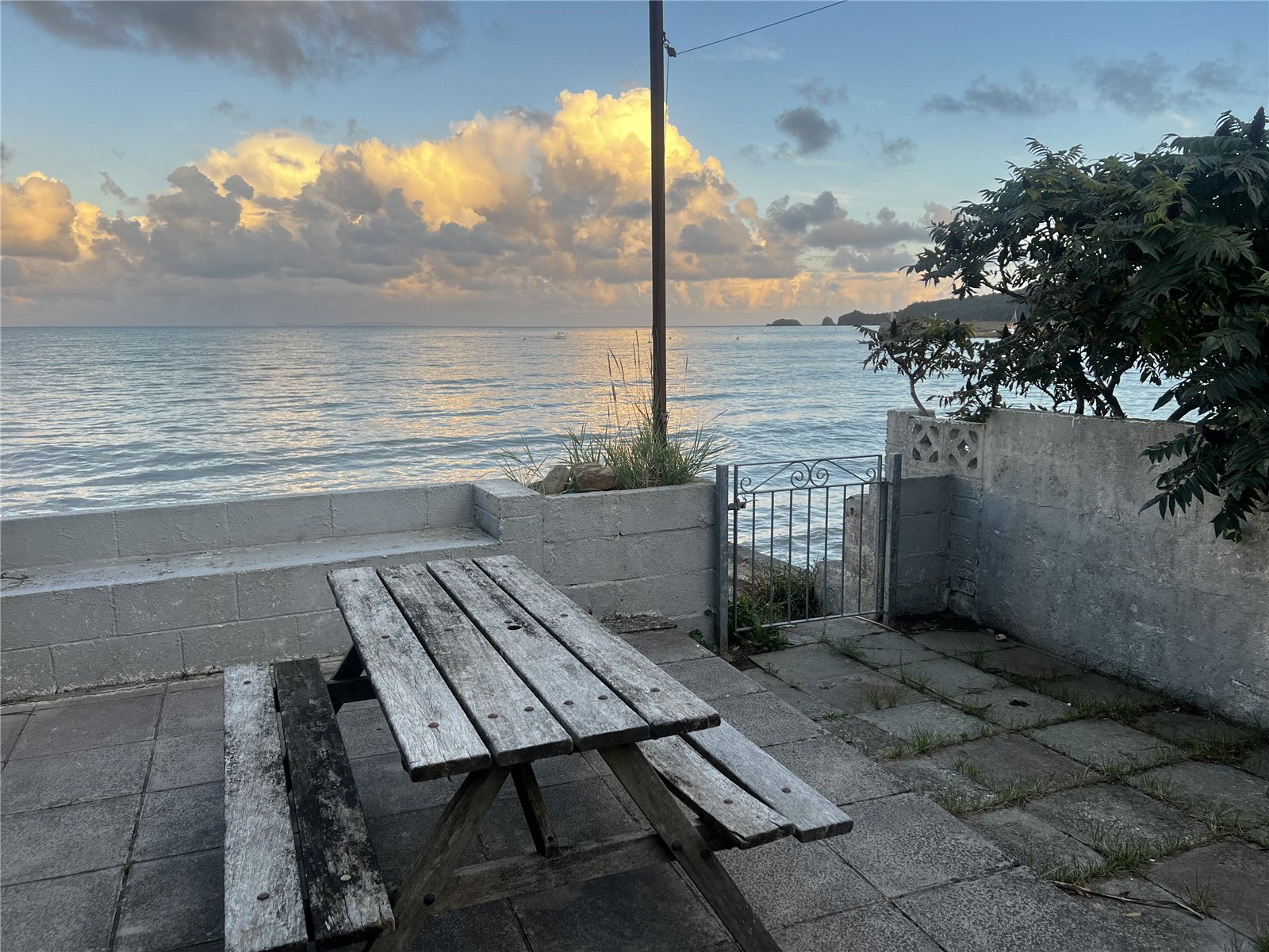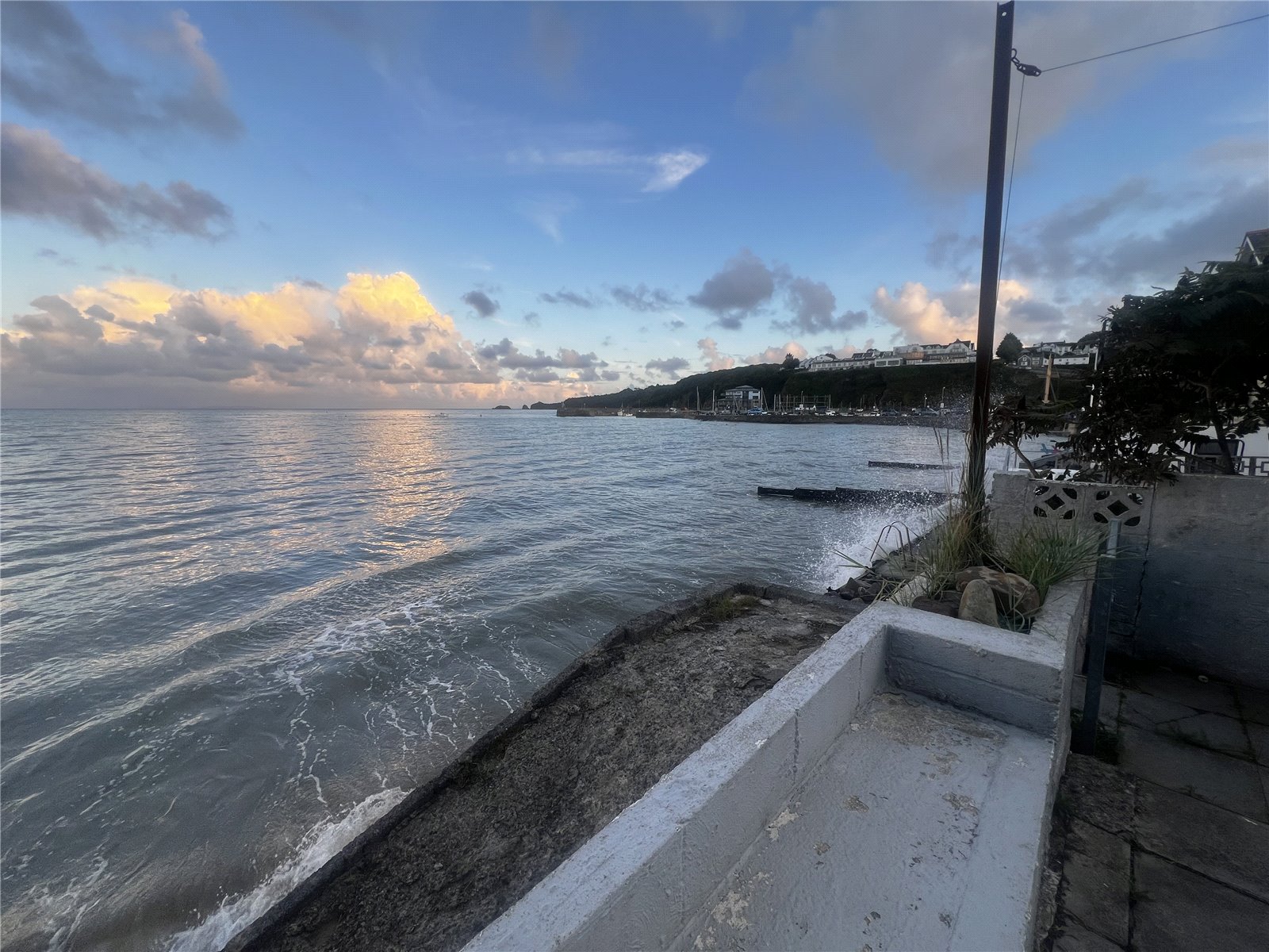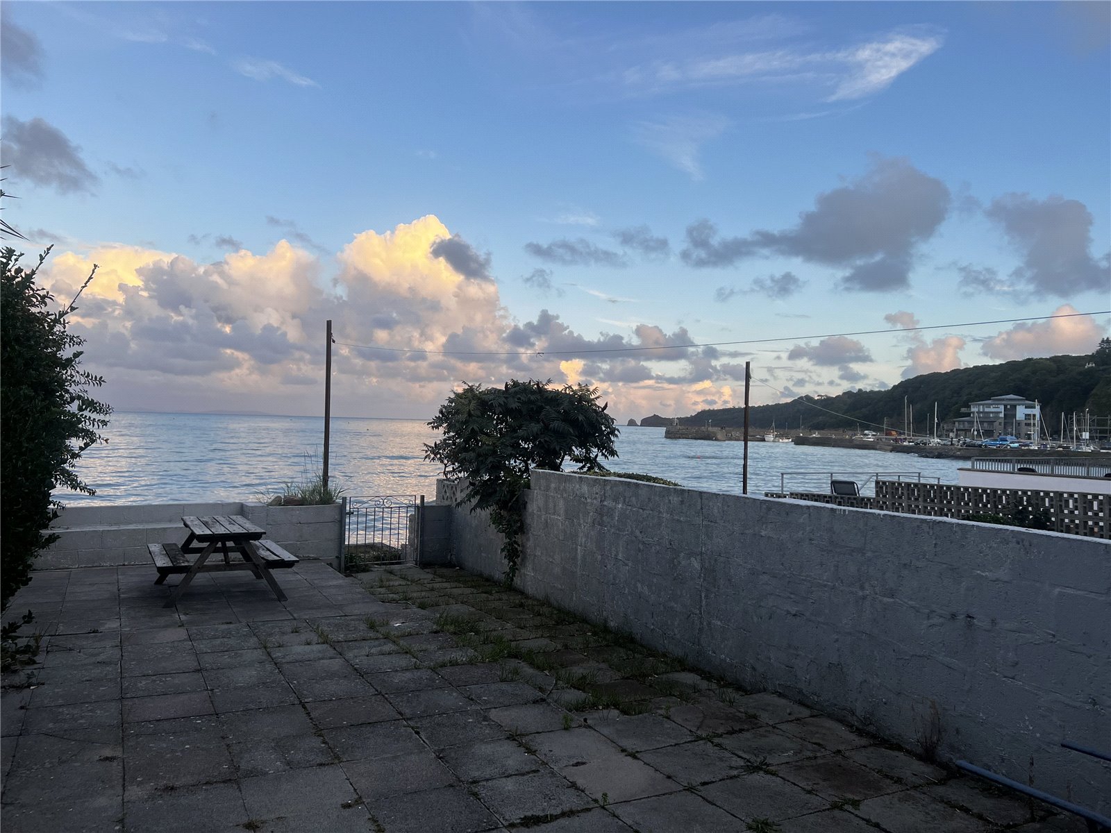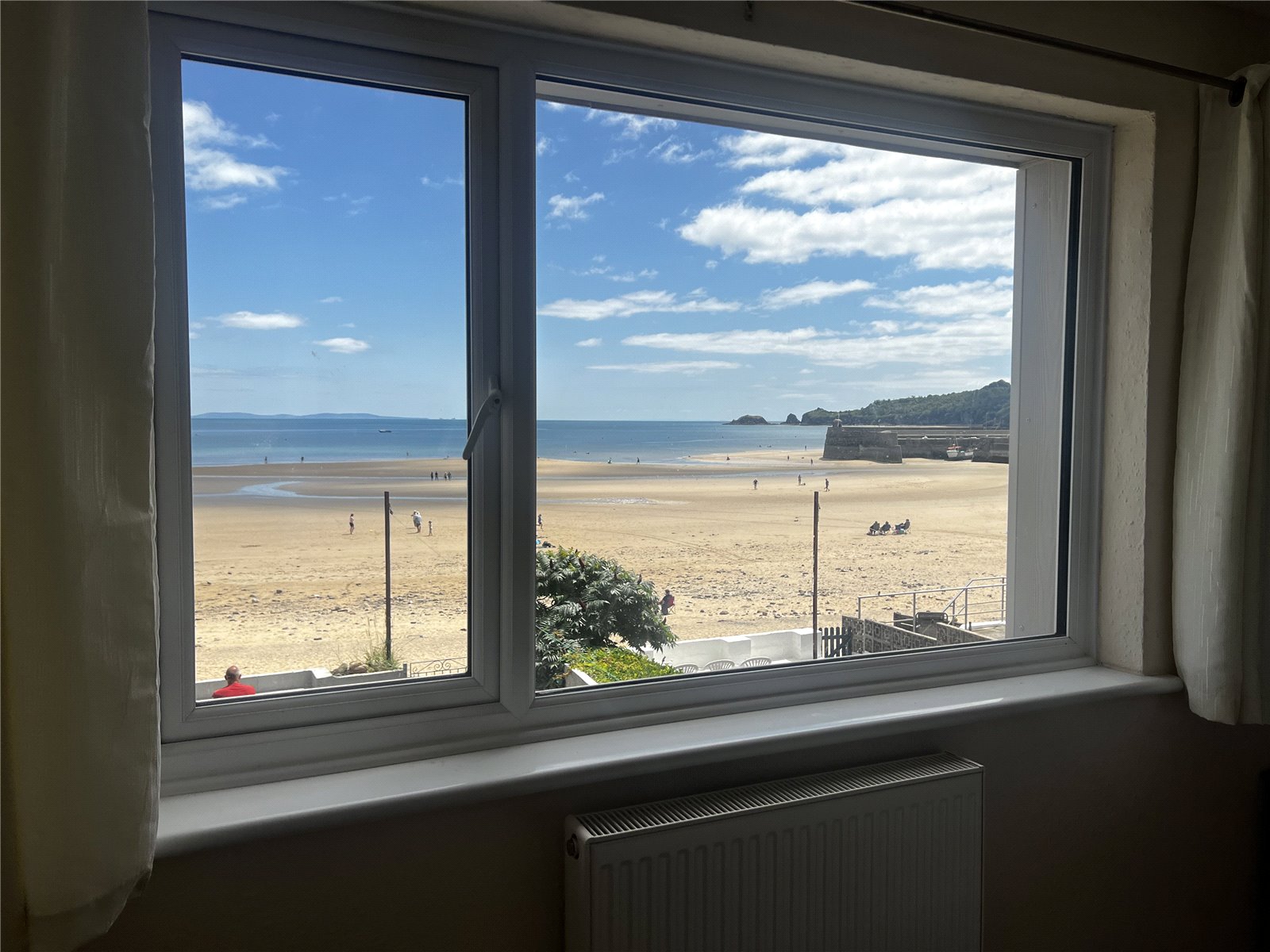 Bedroom 1 with carpeted flooring, a radiator and a double glazed window offering sea views over Saundersfoot Beach.