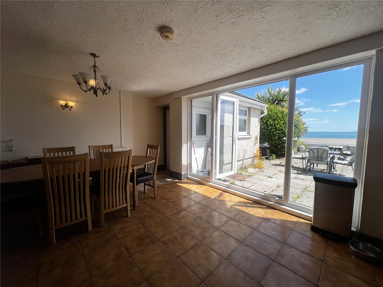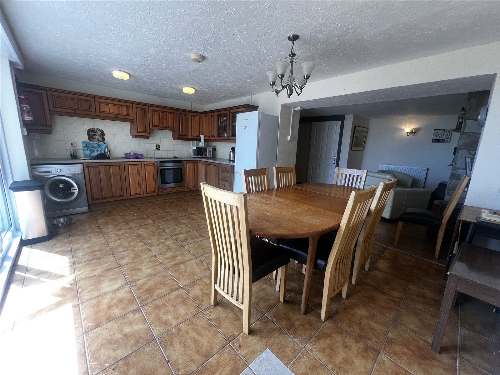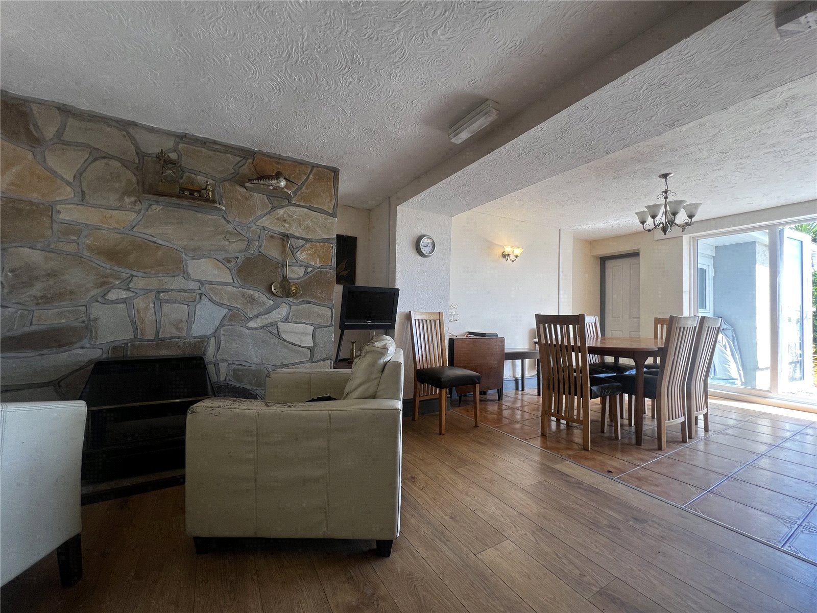 Spacious and well-appointed kitchen/dining area featuring a mix of LVT and tile flooring. Fitted with wall and base mounted units, integrated cooker with electric hob, sink with drainer, and tiled backsplash. Offers space for white goods and includes two radiators, an electric fireplace, and a striking feature stone wall. Double glazed full-length windows and double doors open onto the rear patio. Provides access to the cellar and a shower room.