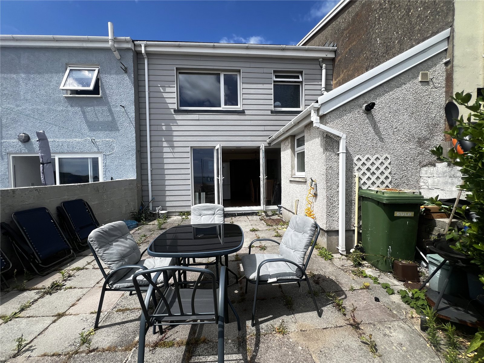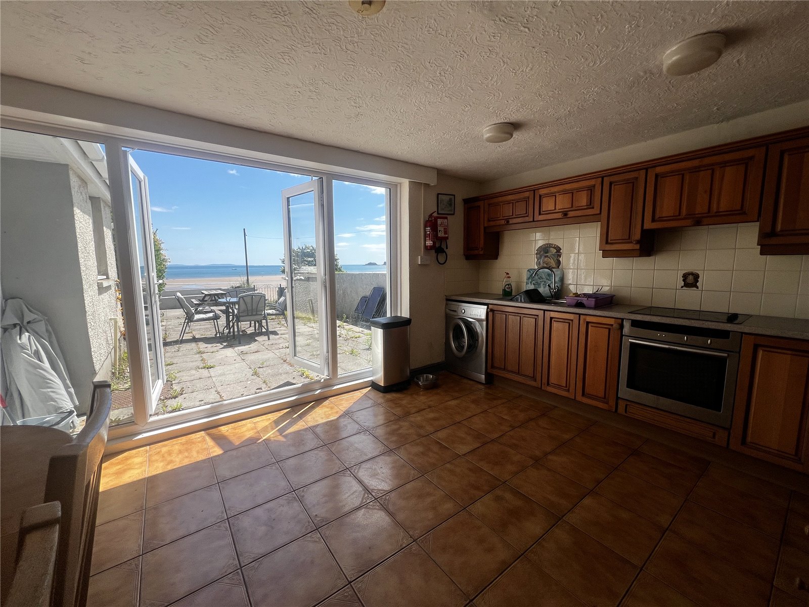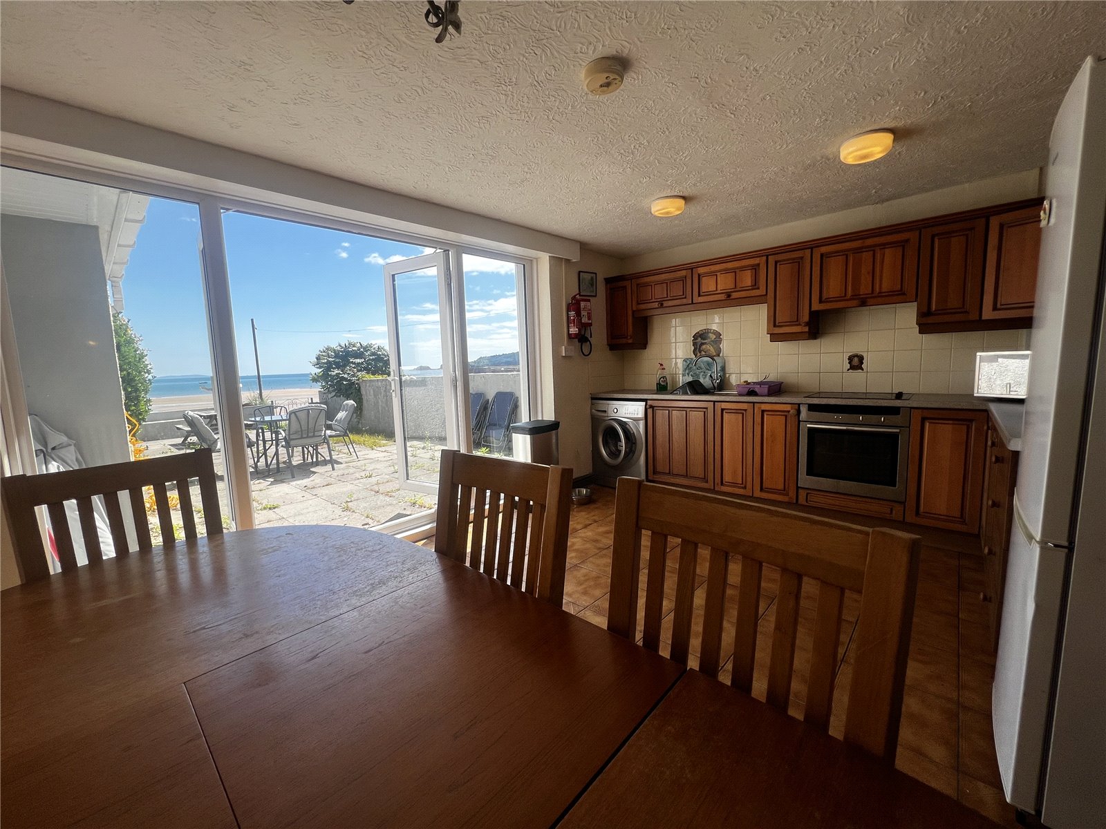 Spacious and well-appointed kitchen/dining area featuring a mix of LVT and tile flooring. Fitted with wall and base mounted units, integrated cooker with electric hob, sink with drainer, and tiled backsplash. Offers space for white goods and includes two radiators, an electric fireplace, and a striking feature stone wall. Double glazed full-length windows and double doors open onto the rear patio. Provides access to the cellar and a shower room.