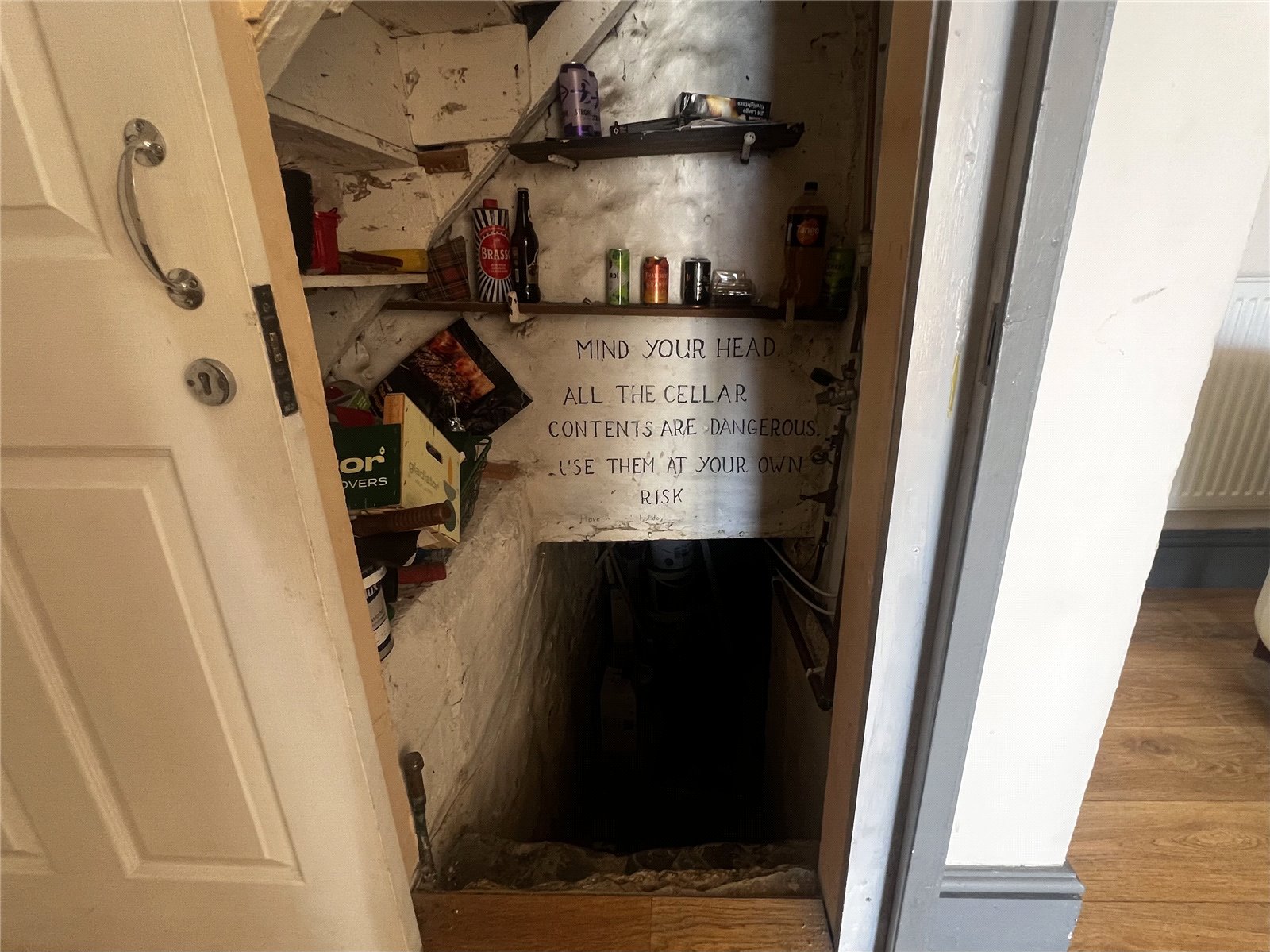 Underground cellar with concrete flooring and characterful stone walls, complete with a radiator for added warmth. Ideal for storage or potential additional use.