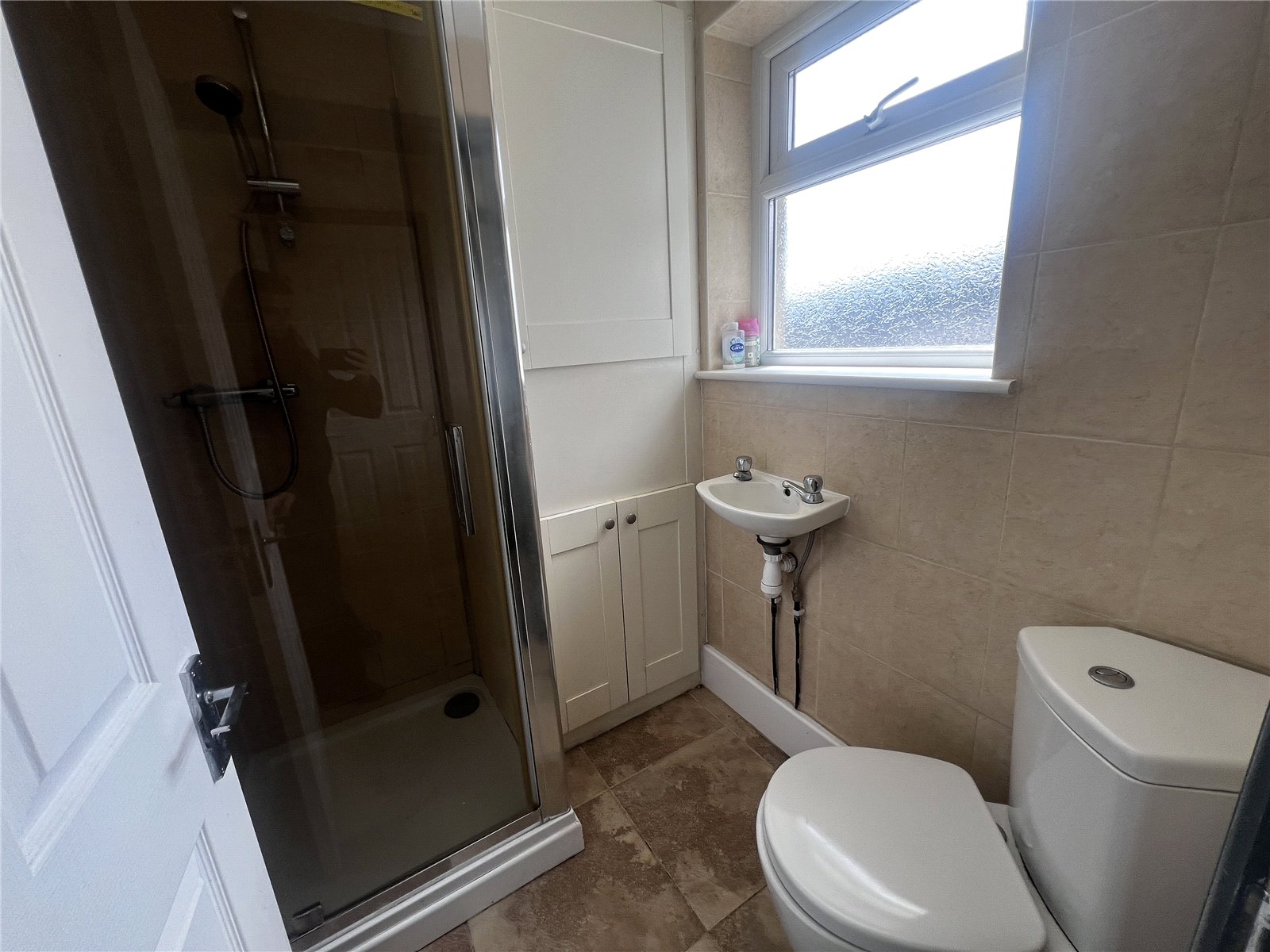 Accessed through a small entrance off the kitchen—where a door leads out to the rear patio—the shower room includes a standalone shower, wall-mounted wash hand basin, and WC. Features tiled flooring, a wall-mounted heated towel rack, built-in storage, and a double glazed frosted window for natural light and privacy.