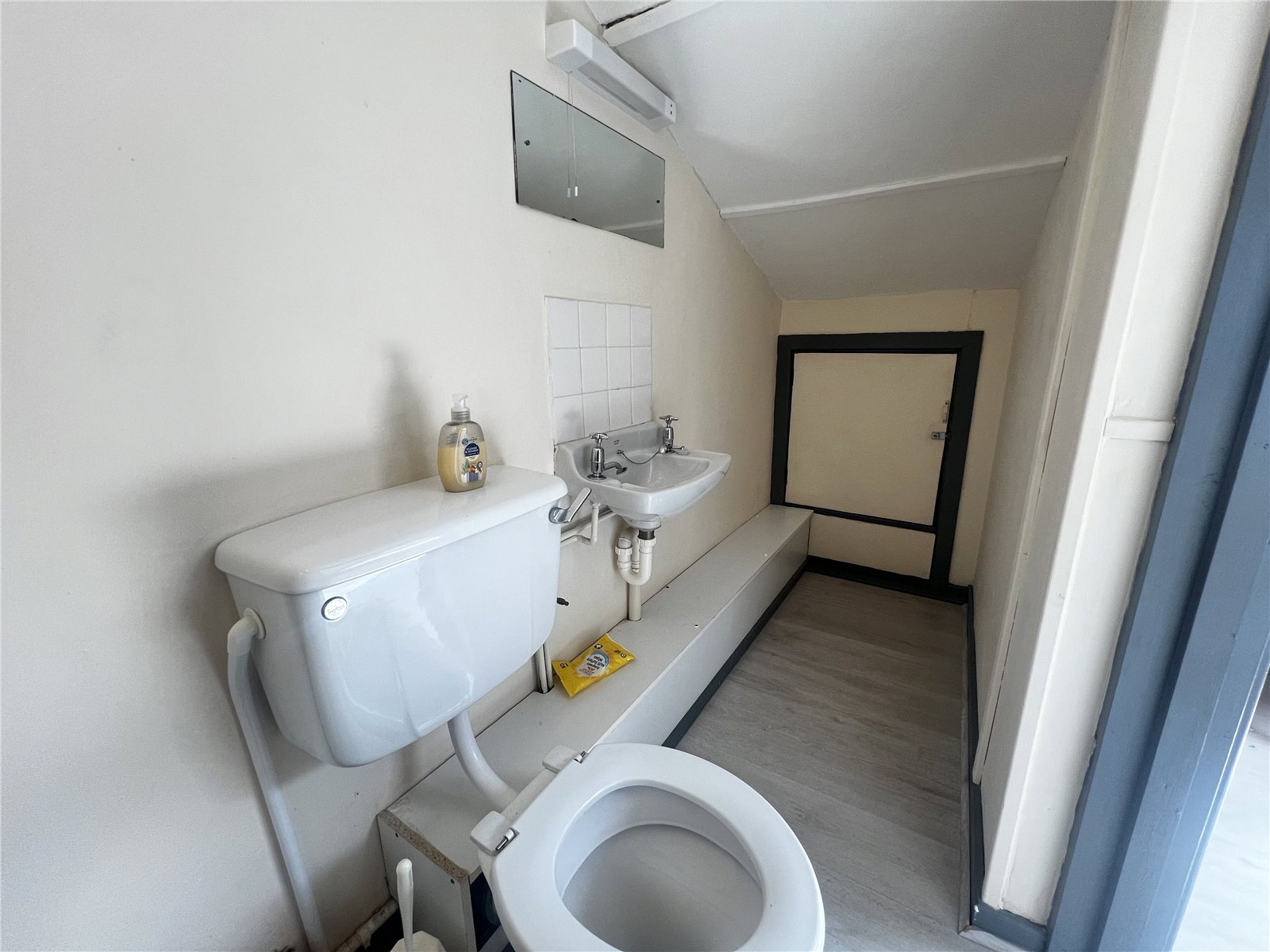 Convenient upstairs WC with a wall-mounted wash-hand basin, tiled splashback, and built-in storage.