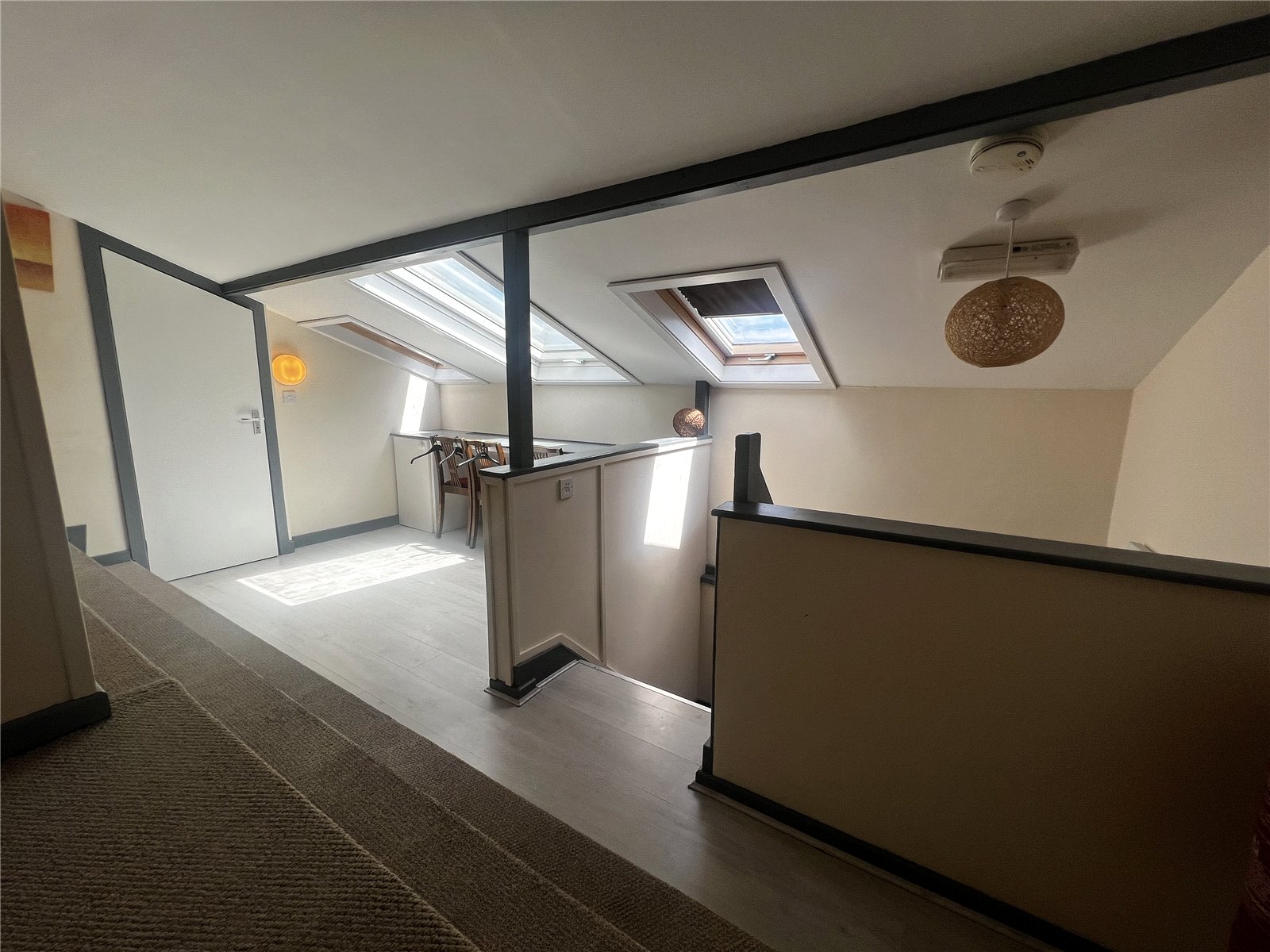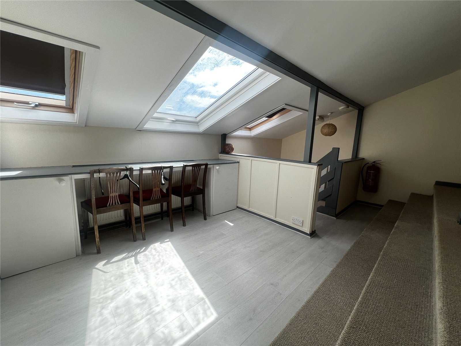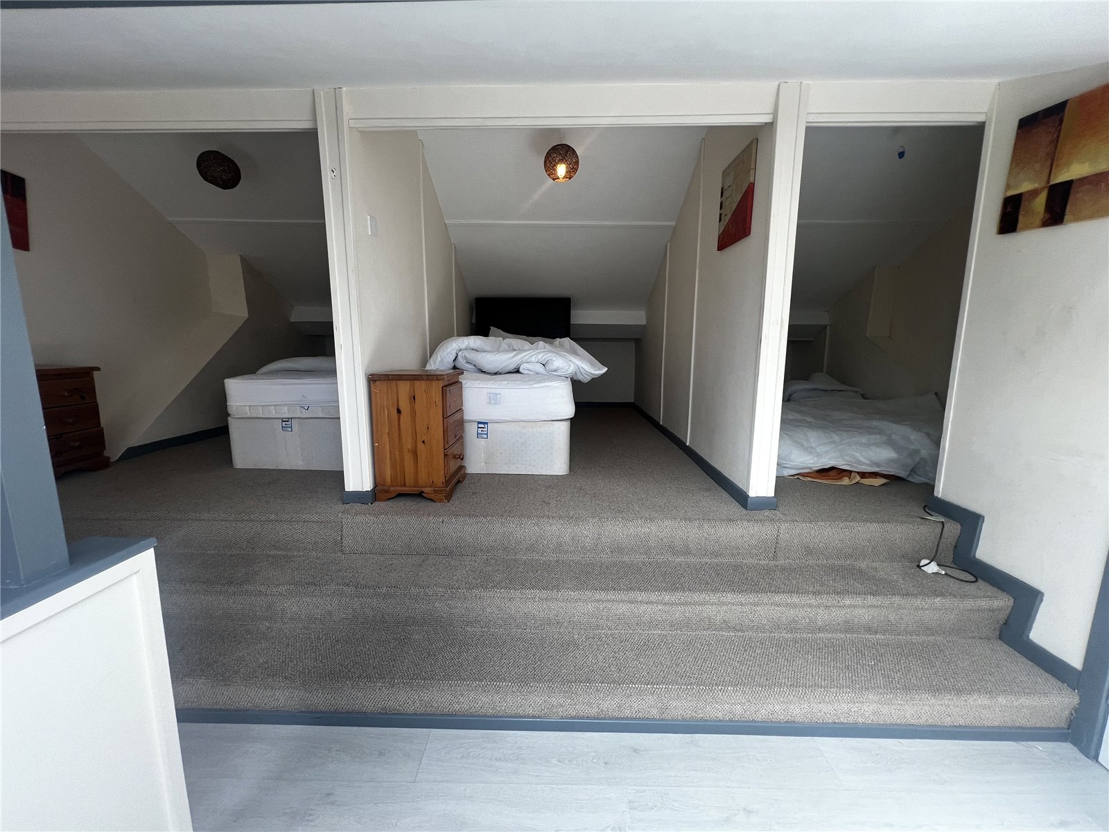 Split-level converted attic bedroom featuring a mix of vinyl and carpet flooring, partition walls, three Velux windows, built-in storage, a radiator and access to a WC.. Currently configured as a bunk room accommodating up to five people.