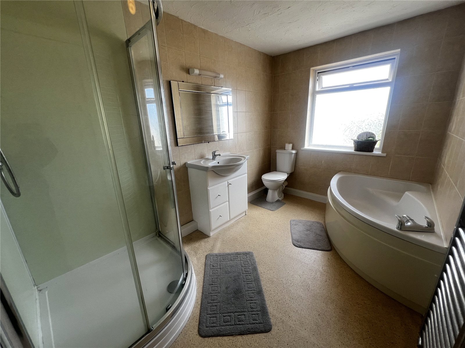 Bathroom with bathtub, standalone shower, sink, WC, and laminate flooring. Features tiled walls, a double glazed frosted window, and a wall-mounted heated towel rack.