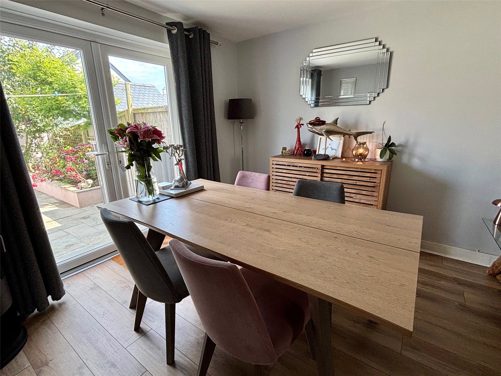 Externally, the home continues to impress. To the front, there is a lawned verge and a driveway providing off-road parking, leading to the integral garage. A gated side entrance provides access to the fully enclosed rear garden—ideal for families with children or pets.