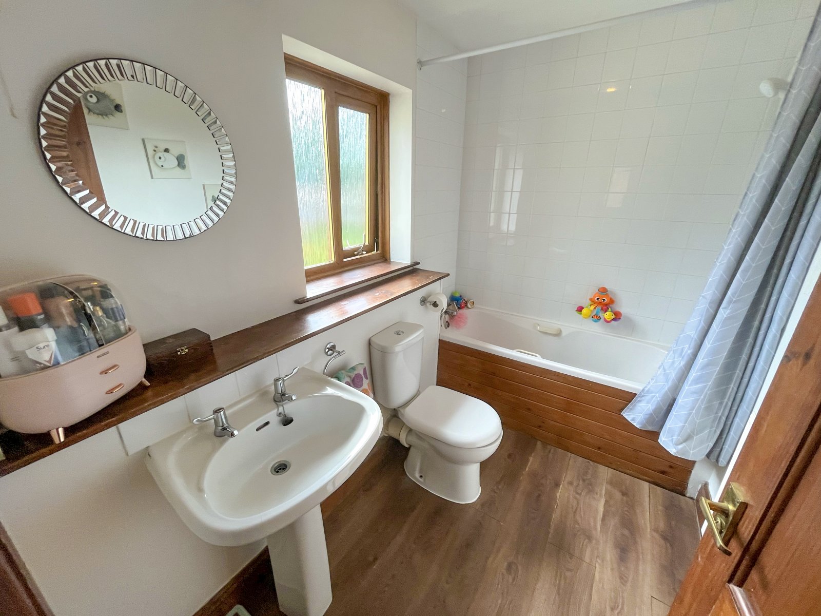 Laminate wood flooring, bath with electric shower over, close-coupled WC, wash hand basin, uPVC double-glazed window with obscured glass, extractor fan, radiator, light fitting.