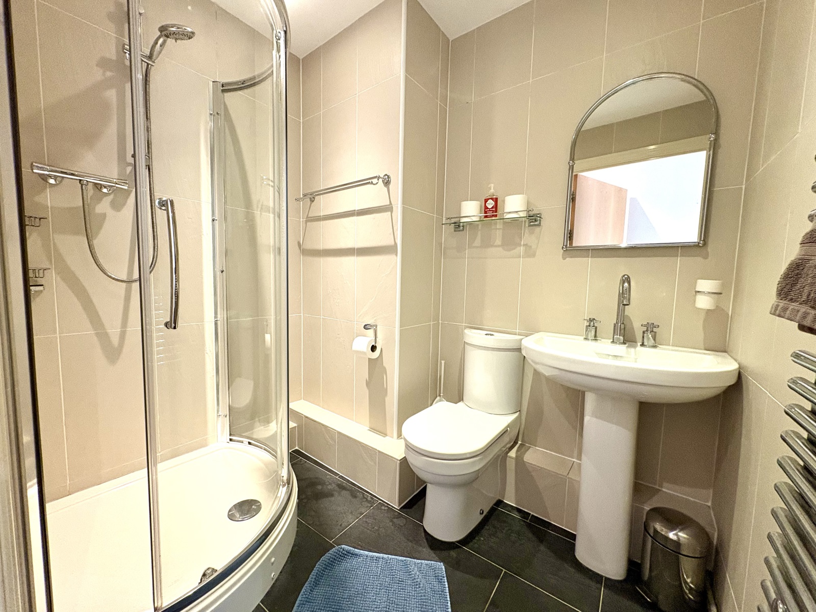 Shower, WC, wash hand basin, fully tiled walls and floors, heated towel rail.
