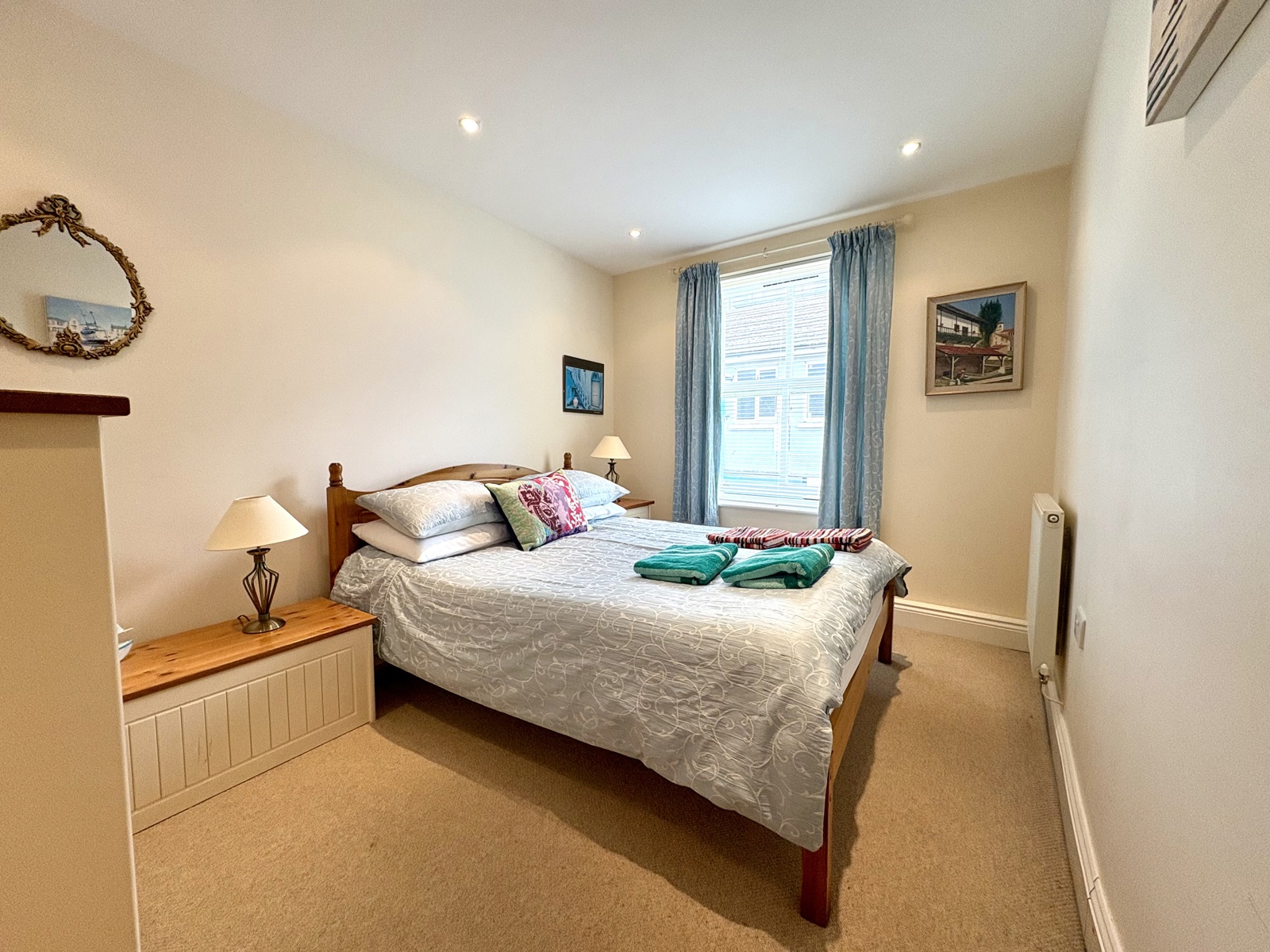 Carpet flooring, radiator, timber frame sash window to front..