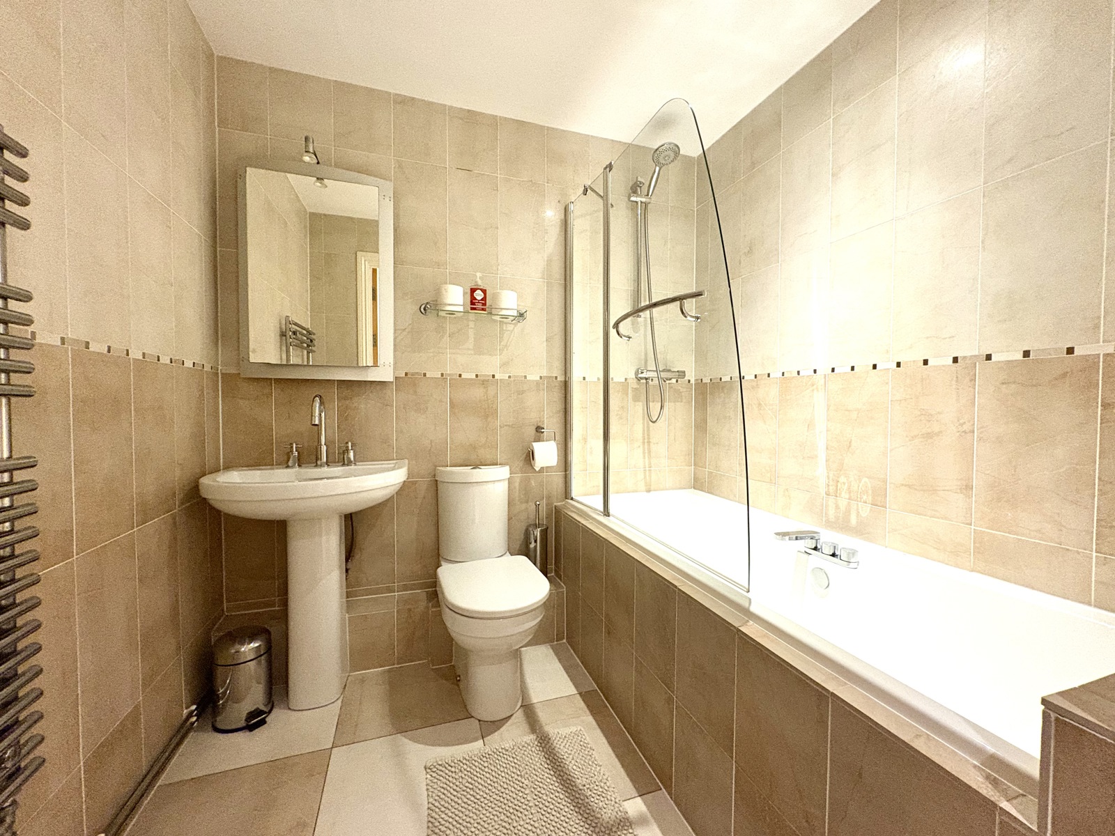 WC, hand wash-hand basin with mixer tap and double ended bath with mains shower over and glass screen. Heated towel rail, fully tiled walls and floors.