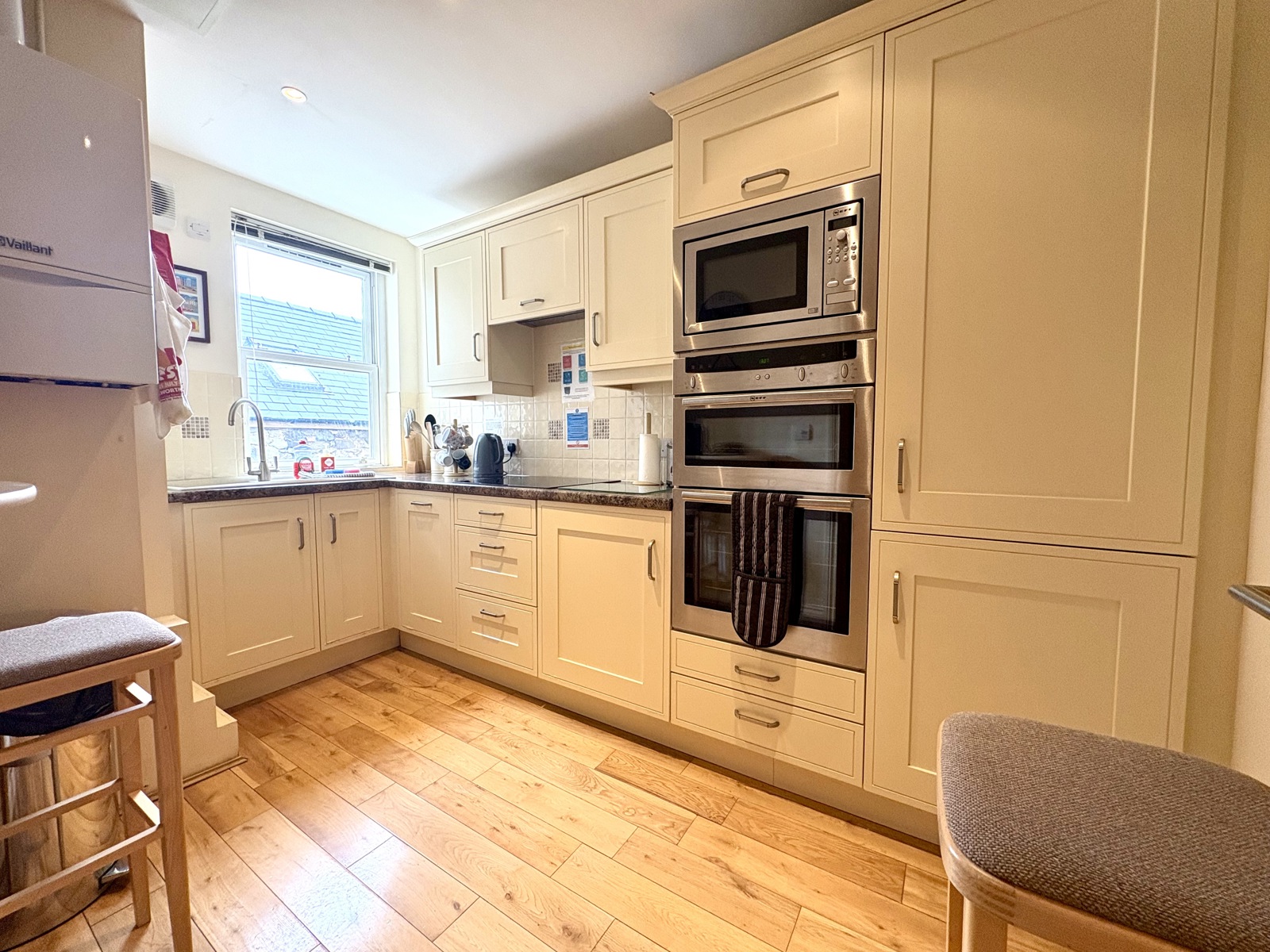 wood flooring, range of wall and base units housing integrated NEFF appliances - oven, microwave, washing machine, slimline dishwasher, fridge freezer. Also comprising stainless steel sink and drainer with mixer tap and 4 ring induction hob with extractor over, all mounted Vaillant gas combi-boiler, timber frame sash window to rear.