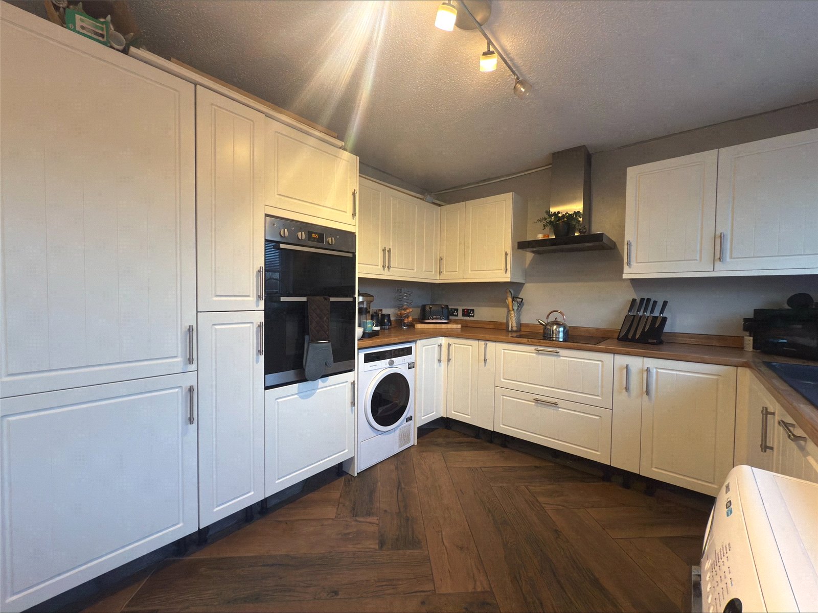 Double-glazed uPVC sliding French doors opening onto the garden, with an additional double-glazed uPVC window overlooking the rear. The kitchen features newly fitted LVT flooring throughout, a range of wall and base units, integrated double oven and induction hob, with space for a washer, dryer and dishwasher, and a radiator.