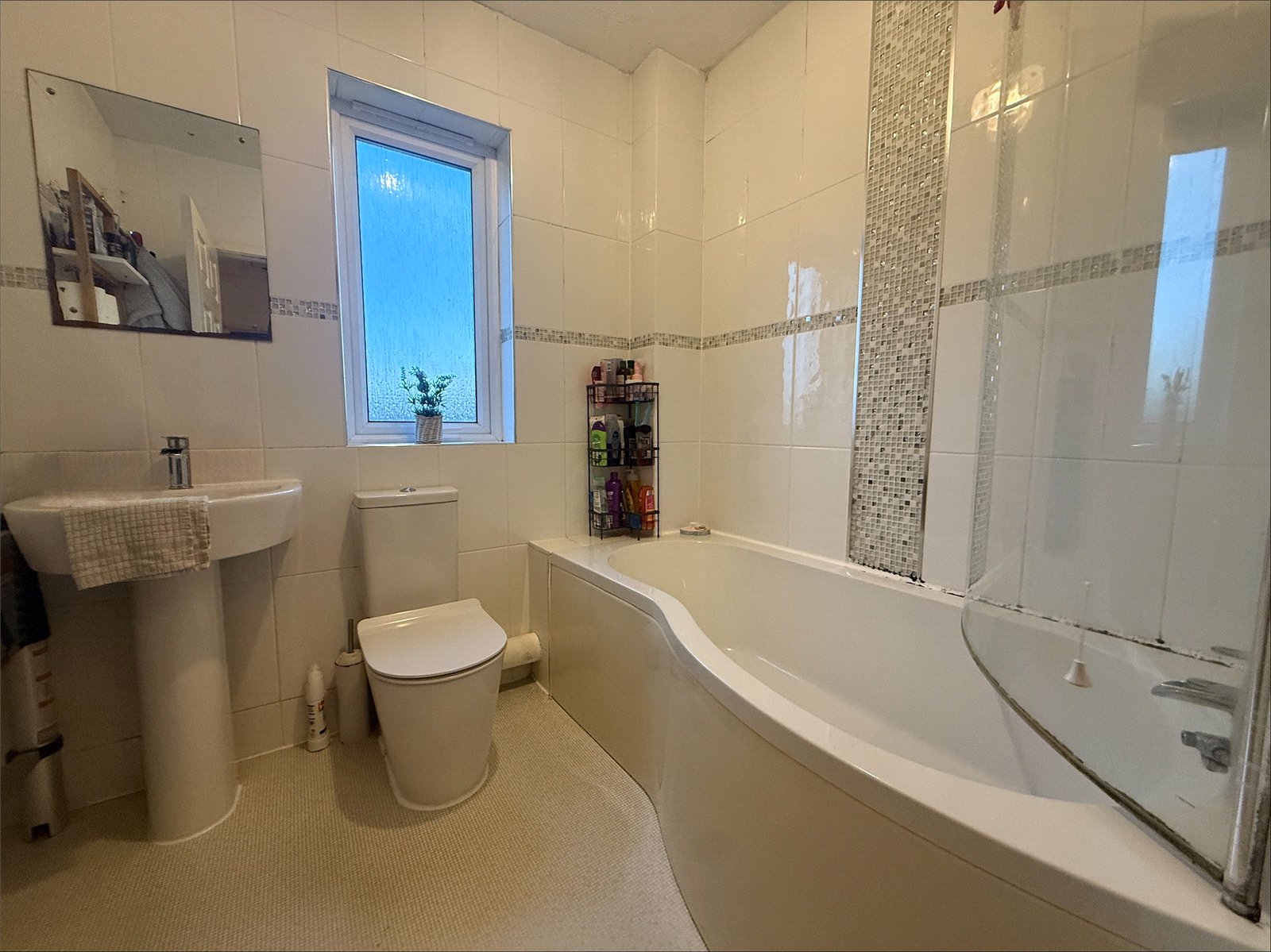 Double-glazed obscured uPVC window providing natural light and privacy, complemented by durable vinyl flooring and fully tiled walls. The bathroom is fitted with a bath incorporating a shower over and a glass screen, along with a WC, wash hand basin and a heated towel rail, creating a practical and well-appointed space.