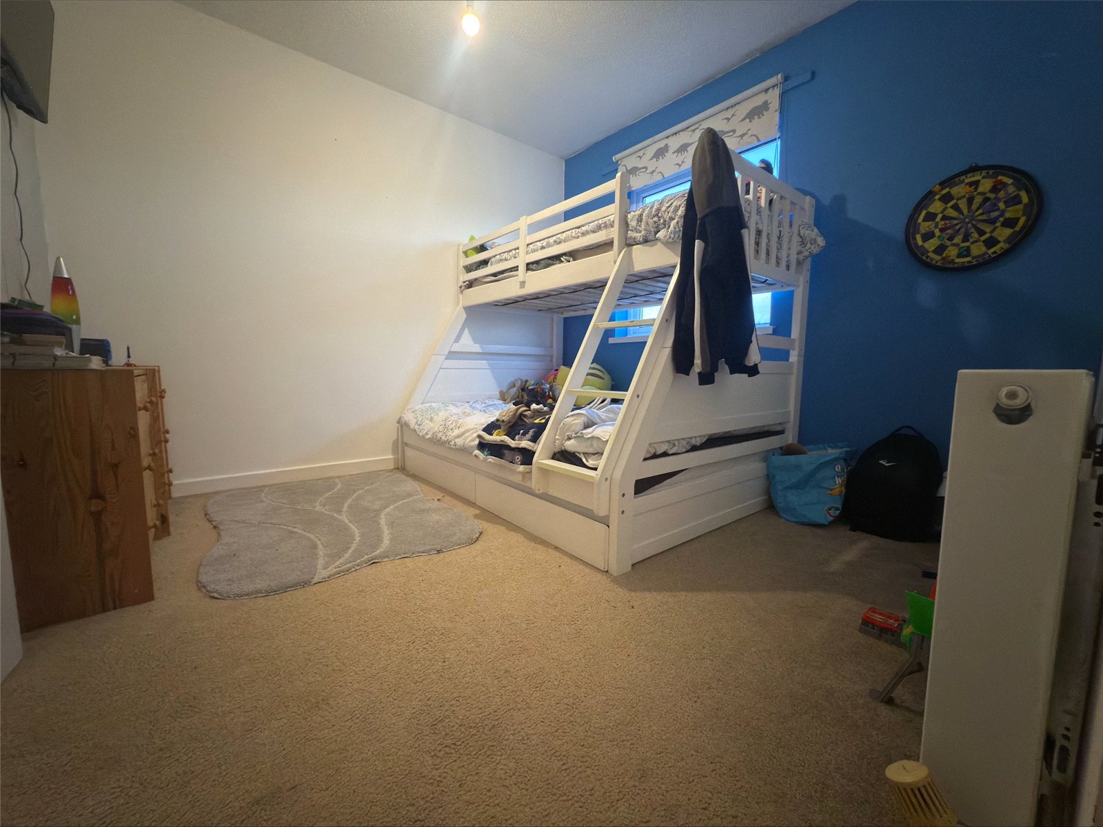 Double-glazed uPVC window overlooking the rear garden, with fitted carpet, a radiator and a useful storage cupboard.