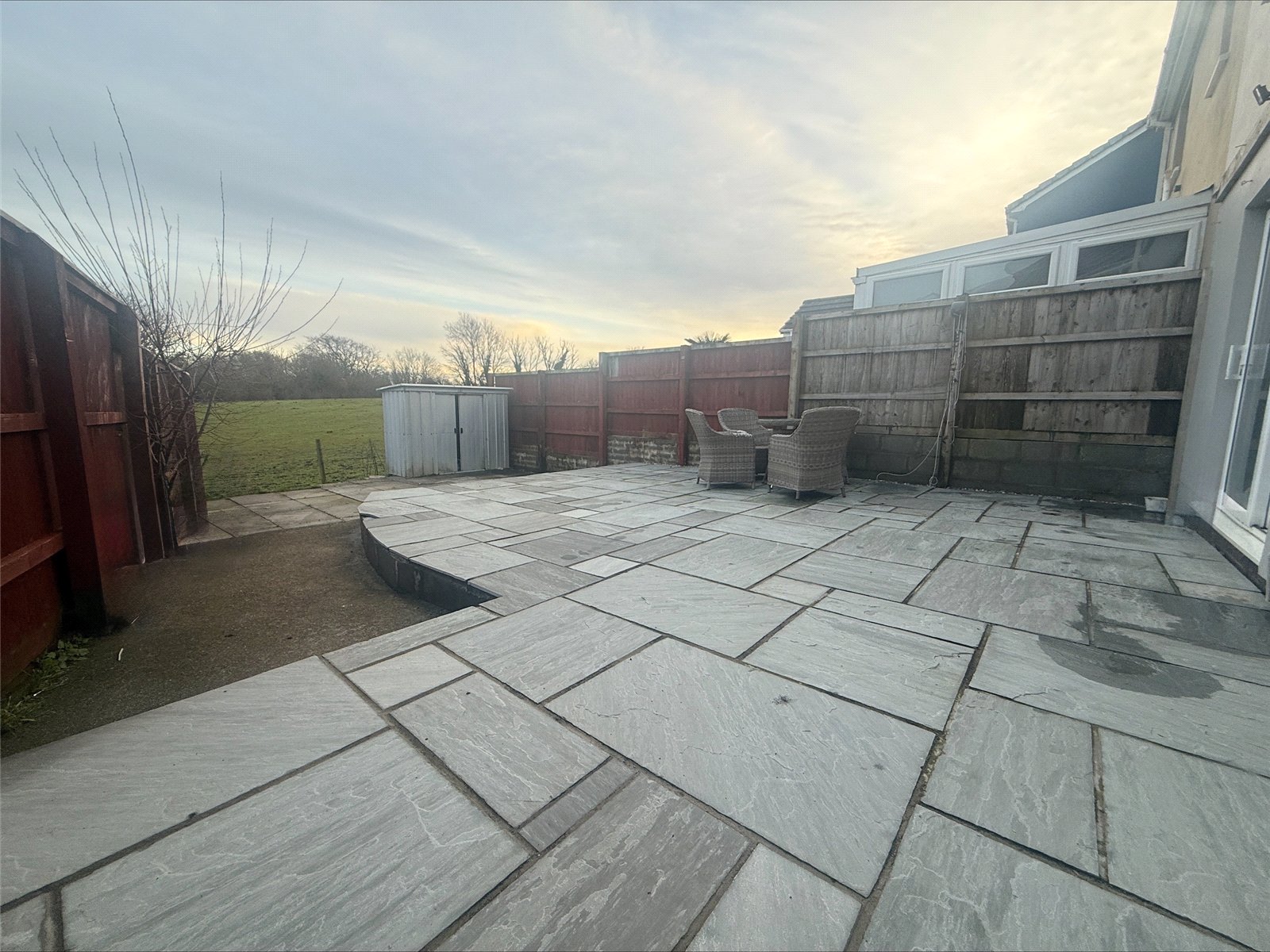 Indian stone patio area with a useful storage shed, enjoying an open outlook over adjoining fields.