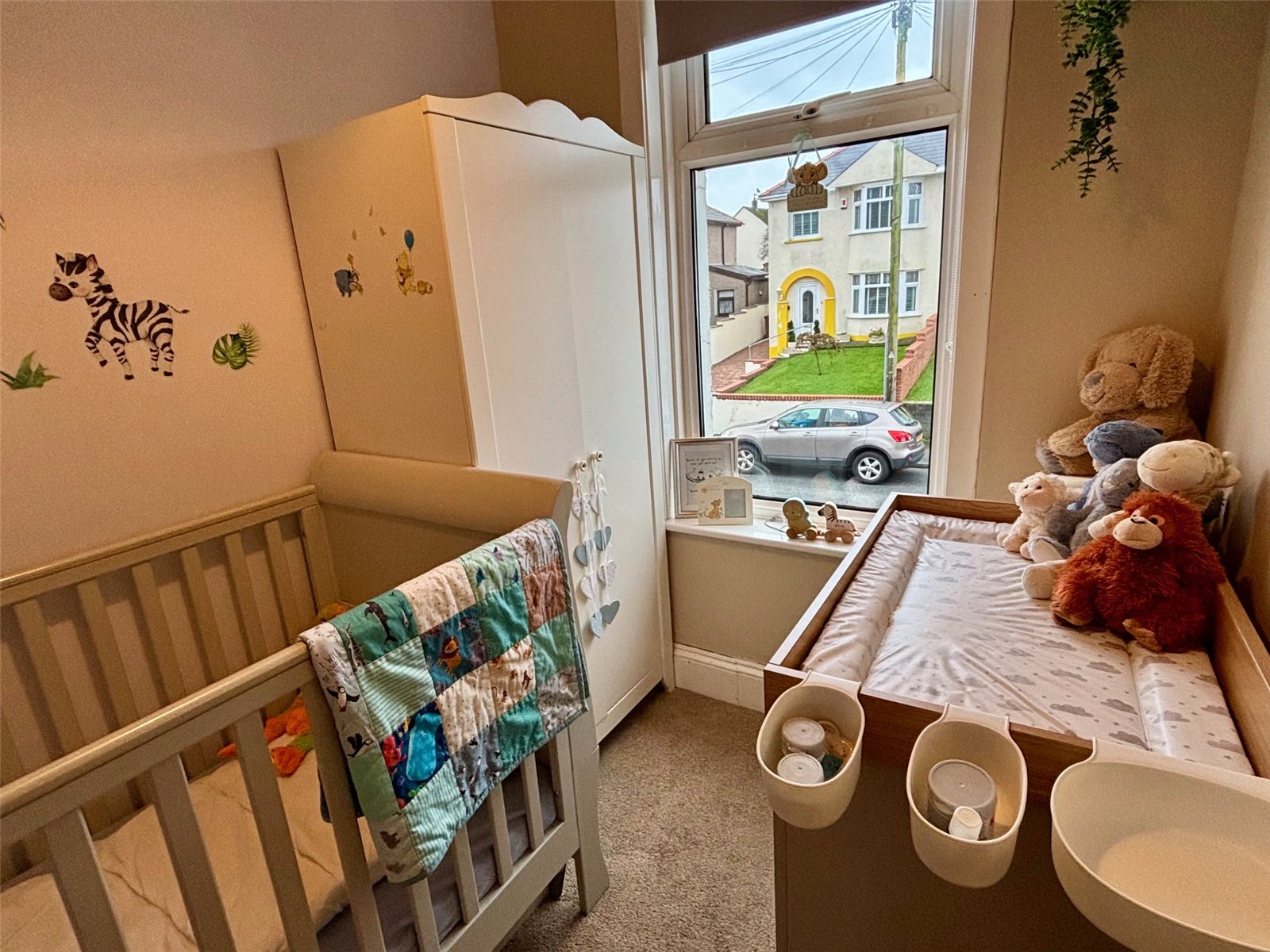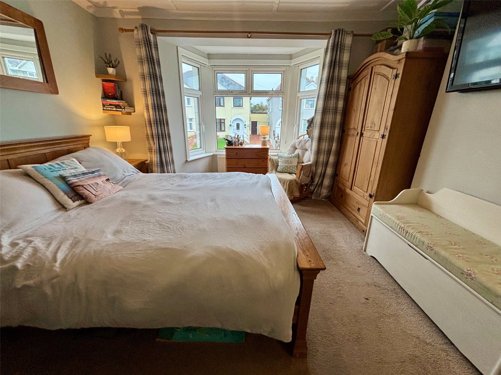 Upstairs, you’ll find three bedrooms—two generous doubles and a good-sized single. The front bedroom features a lovely bay window, while the rear bedroom enjoys fantastic views across Milford Haven. The family bathroom is also located on this floor, and the landing is bright and airy, with loft access and a large window that floods the space with light.