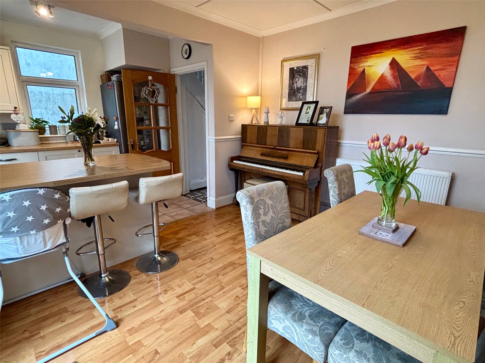 This charming three-bedroom semi-detached family home offers a wonderful blend of character and modern living. Upon entering, you’re greeted by a lovely entrance hallway featuring original ornate tiling, setting the tone for the home’s warmth and style. The inviting lounge boasts a large bay window overlooking the front, filling the room with natural light, and a feature gas fireplace adds a cozy focal point for family gatherings.