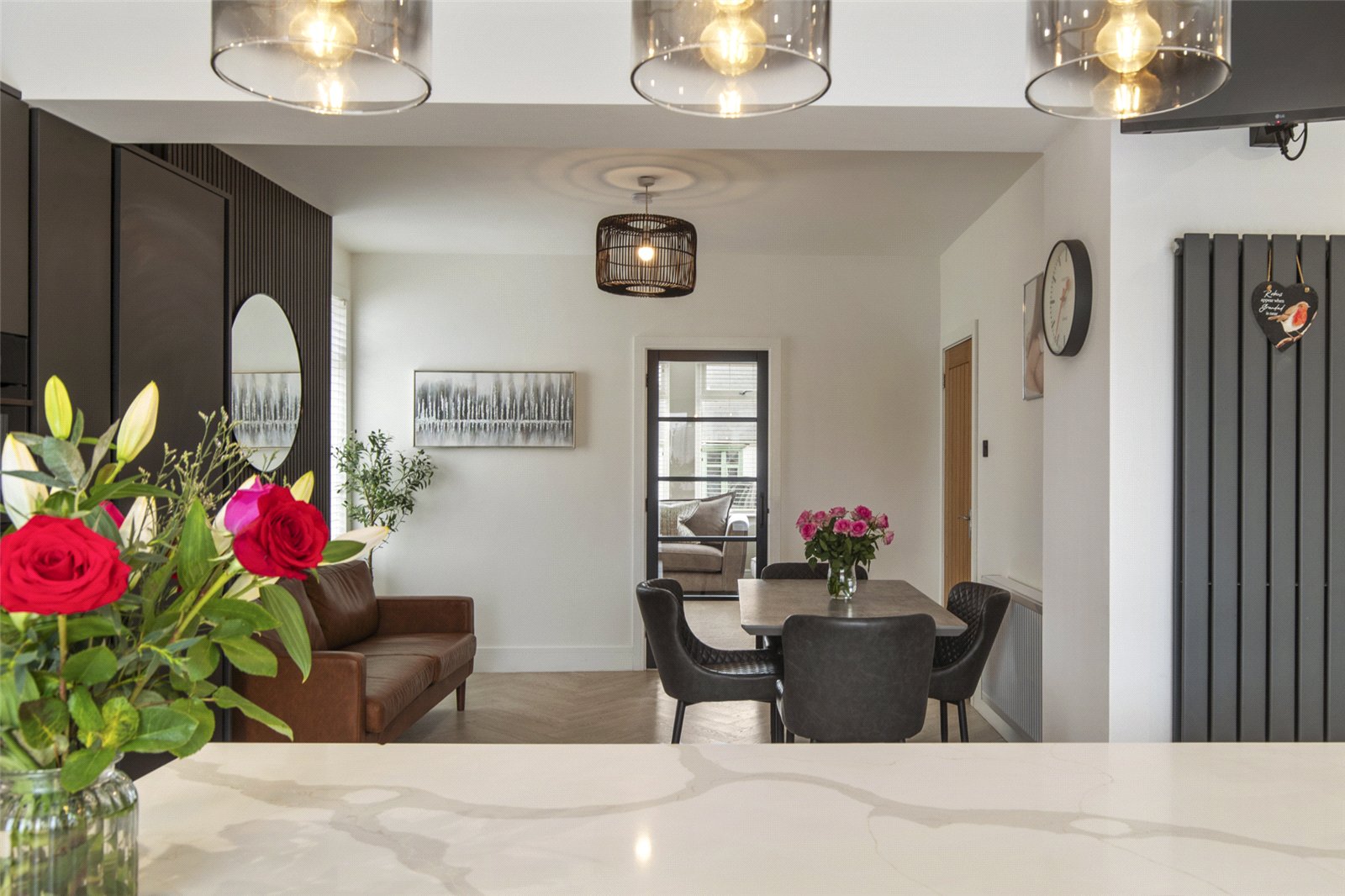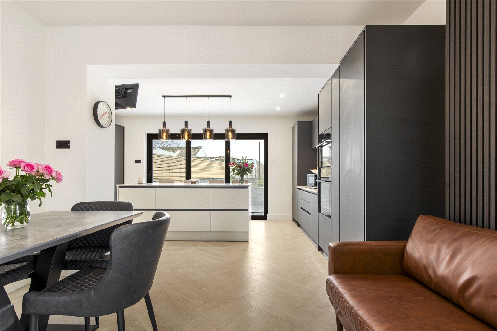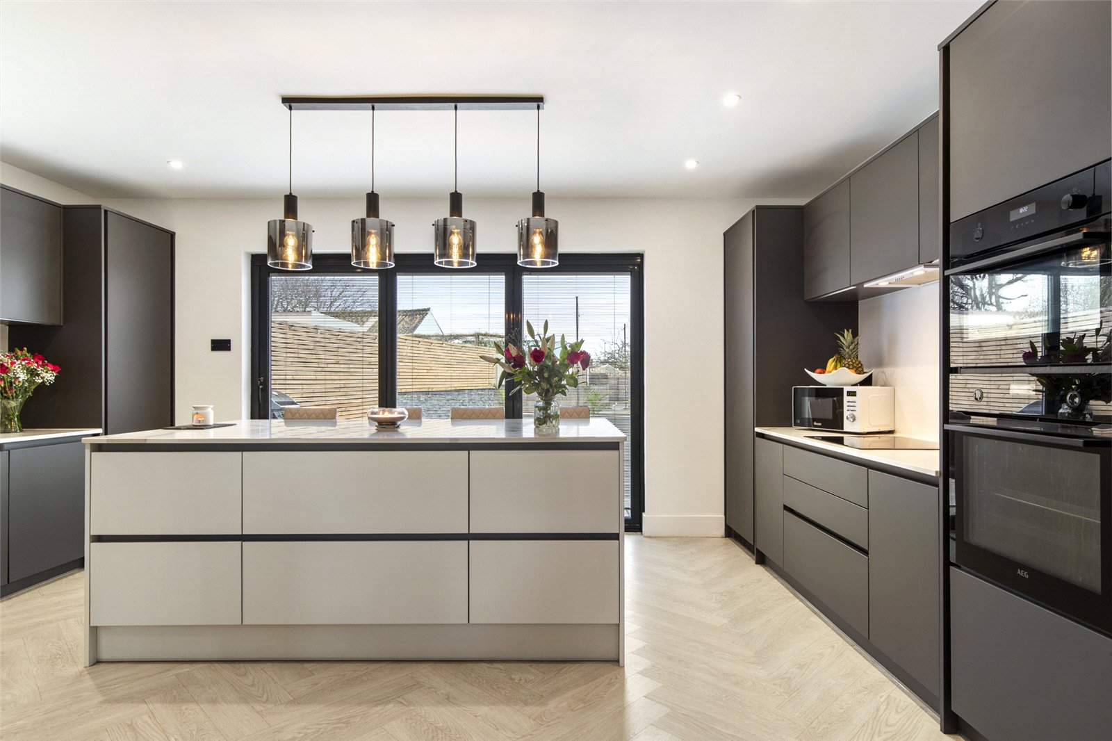Internally, the welcoming entrance hallway boasts a useful storage cupboard and leads into the superbly renovated open-plan kitchen/diner, newly installed in 2024. This modern and contemporary kitchen truly is the hub of the home, featuring bi-fold doors opening onto the rear garden. It has been fitted with an excellent range of cupboards with quartz worktops over and a striking central island — perfect for socialising and a real focal point of the space.