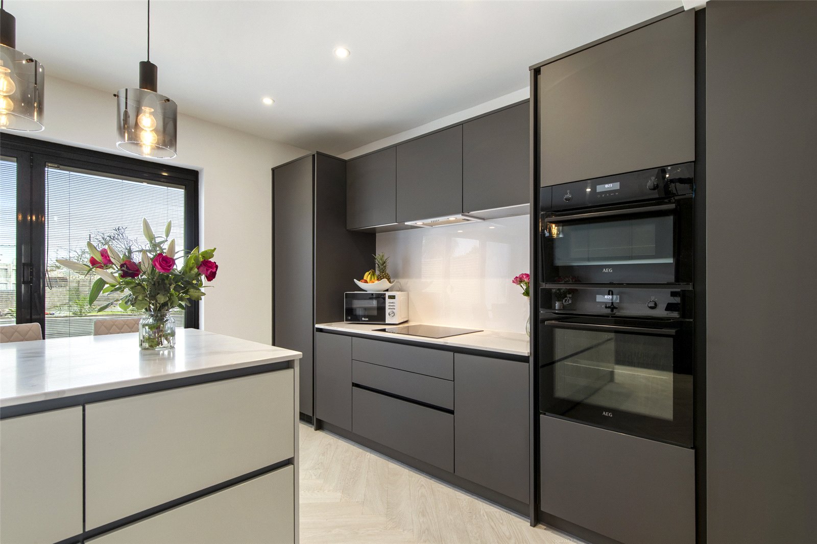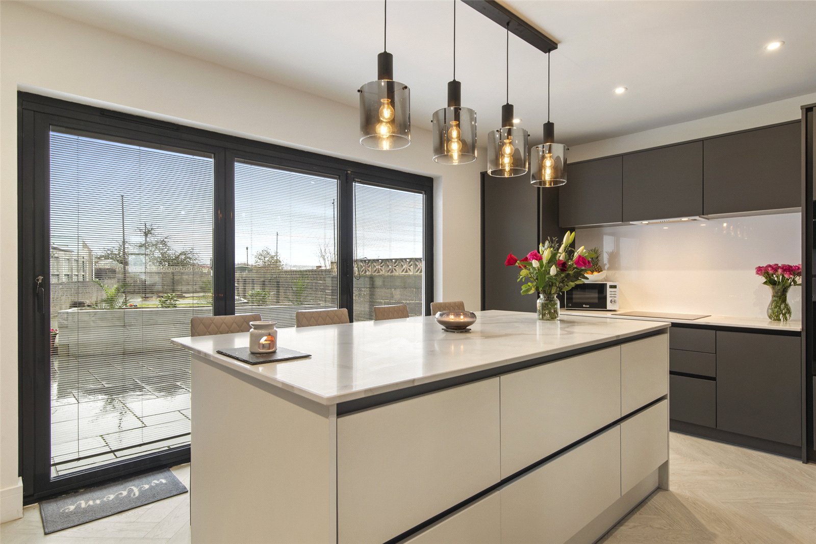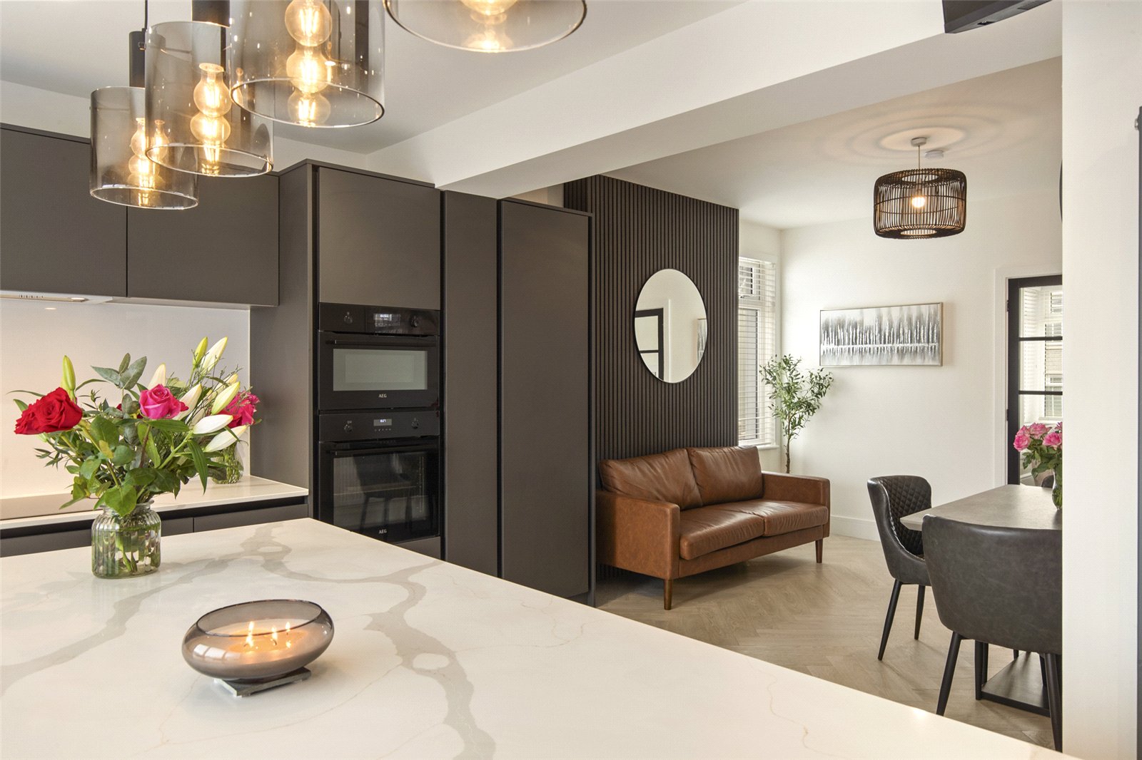 Internally, the welcoming entrance hallway boasts a useful storage cupboard and leads into the superbly renovated open-plan kitchen/diner, newly installed in 2024. This modern and contemporary kitchen truly is the hub of the home, featuring bi-fold doors opening onto the rear garden. It has been fitted with an excellent range of cupboards with quartz worktops over and a striking central island — perfect for socialising and a real focal point of the space.
