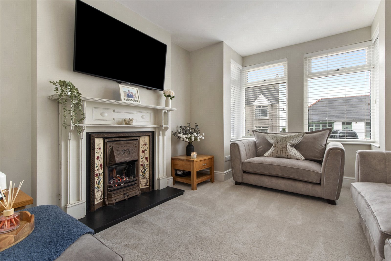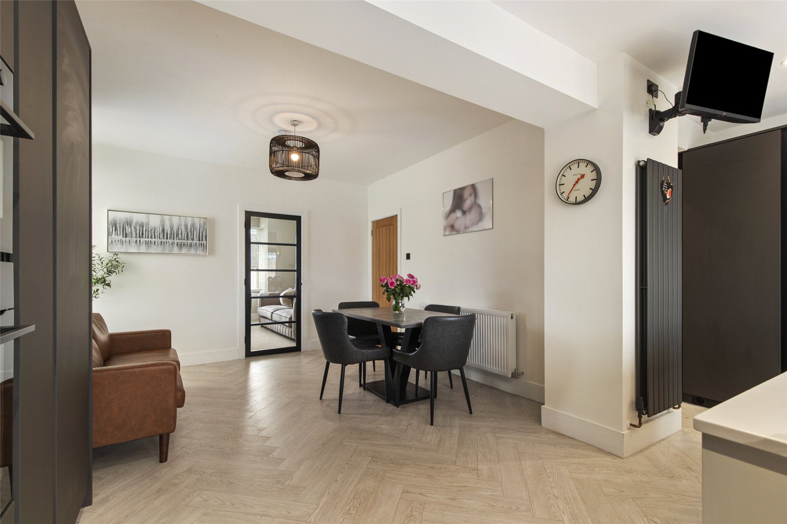 The dining area comfortably accommodates a family-sized table and chairs and could also serve as a second reception room or snug. To the front of the property, the living room features a large bay window and an ornamental gas fire, creating a warm and inviting space.