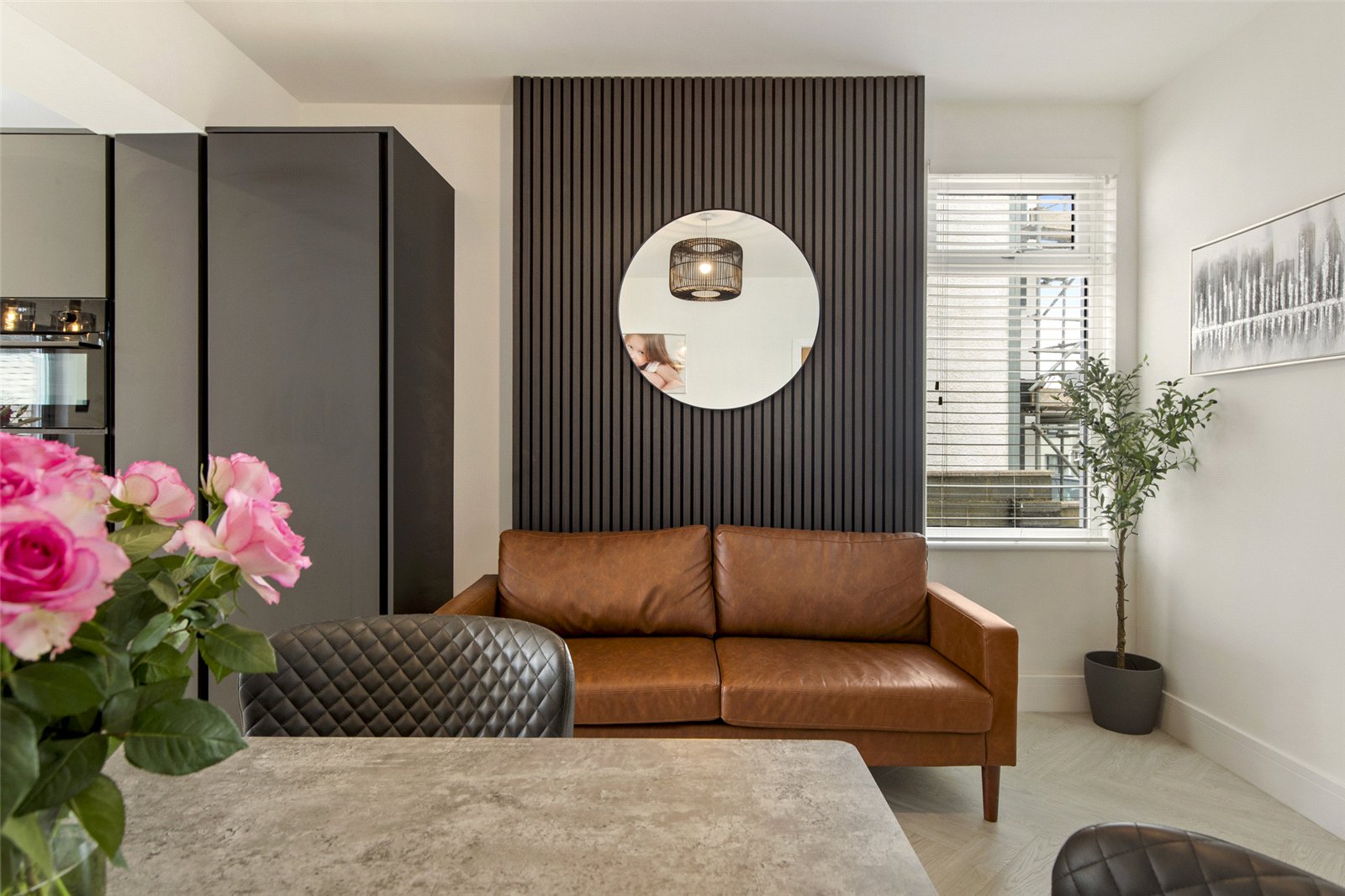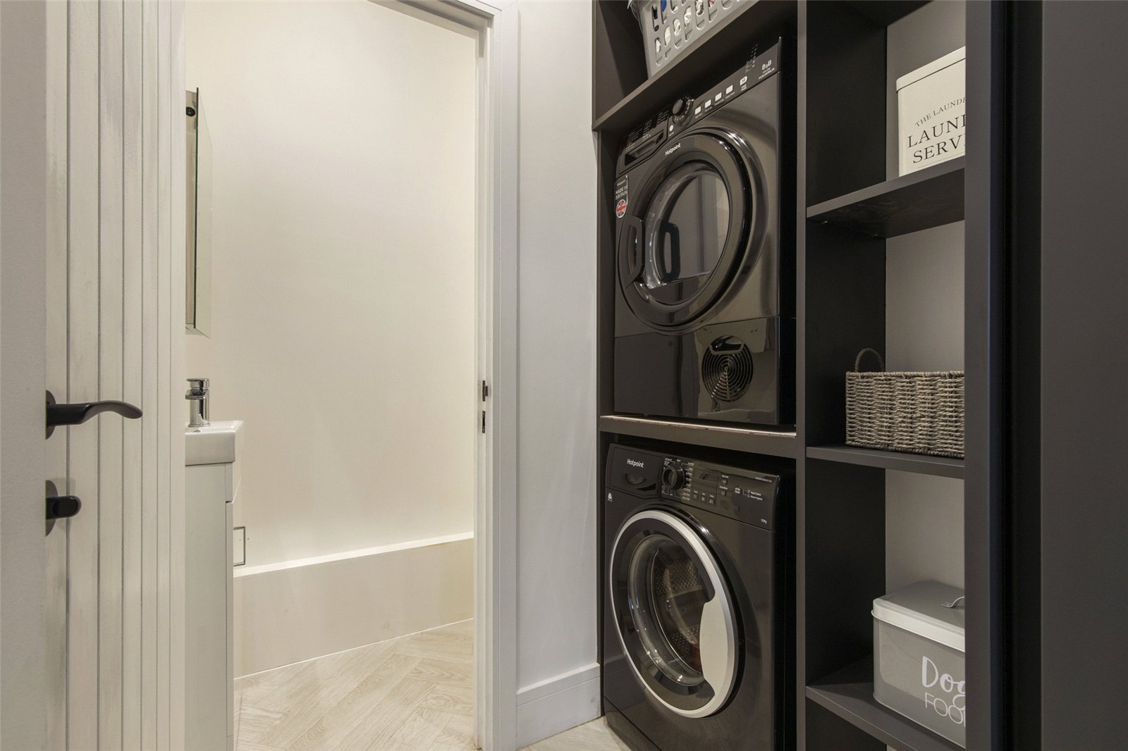 Integral appliances include a full-size fridge, separate freezer, dishwasher, induction hob with cooker hood, built-in bin store, and eye-level microwave double oven. There is access through to a utility area with space and plumbing for additional appliances, along with the added benefit of a downstairs WC. The gas combination boiler, fitted in 2024, is neatly concealed within the kitchen.