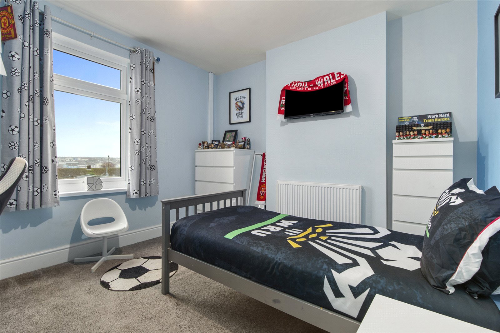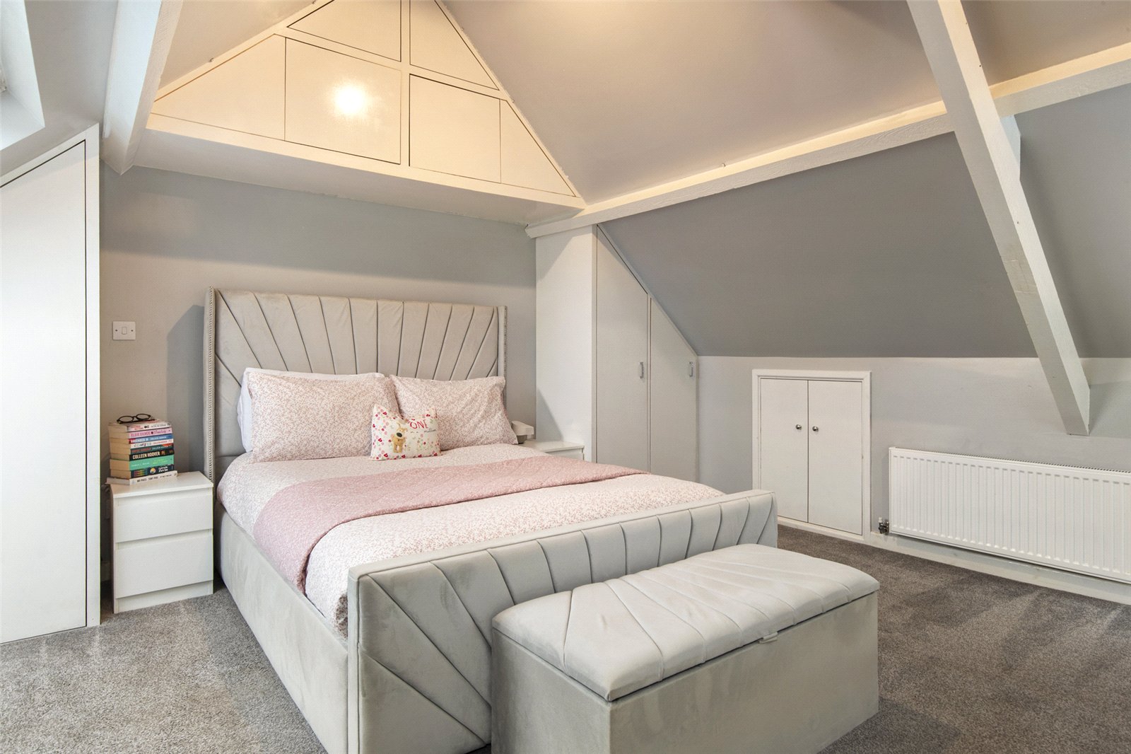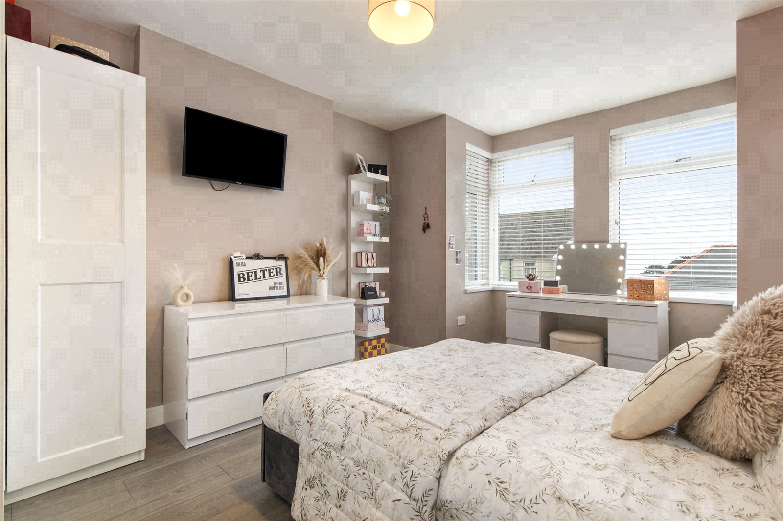 The first-floor landing provides access to the family bathroom, newly installed in 2023, comprising a bath with overhead shower, WC, and wash hand basin. There are two generously sized double bedrooms, one benefiting from fitted wardrobes and a bay window overlooking the front.