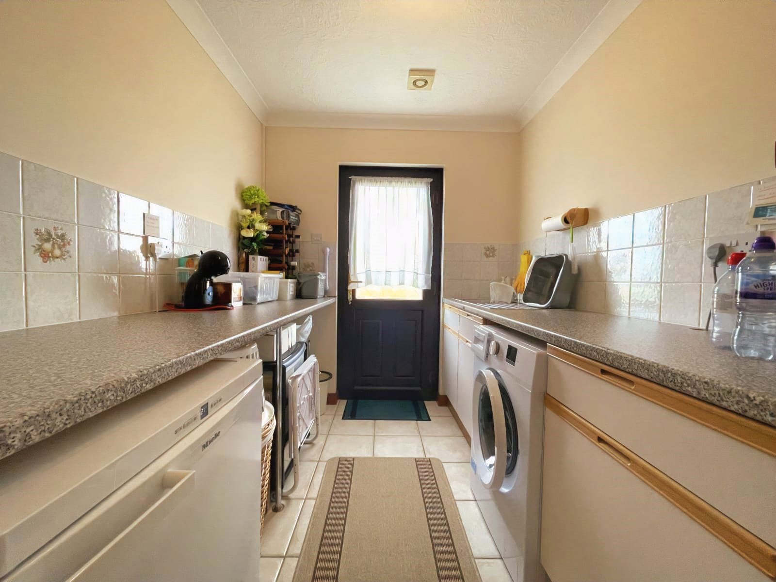 Tile flooring and splashback, space for white goods, range of base units, sink and drainer, double glazed uPVC door to rear.