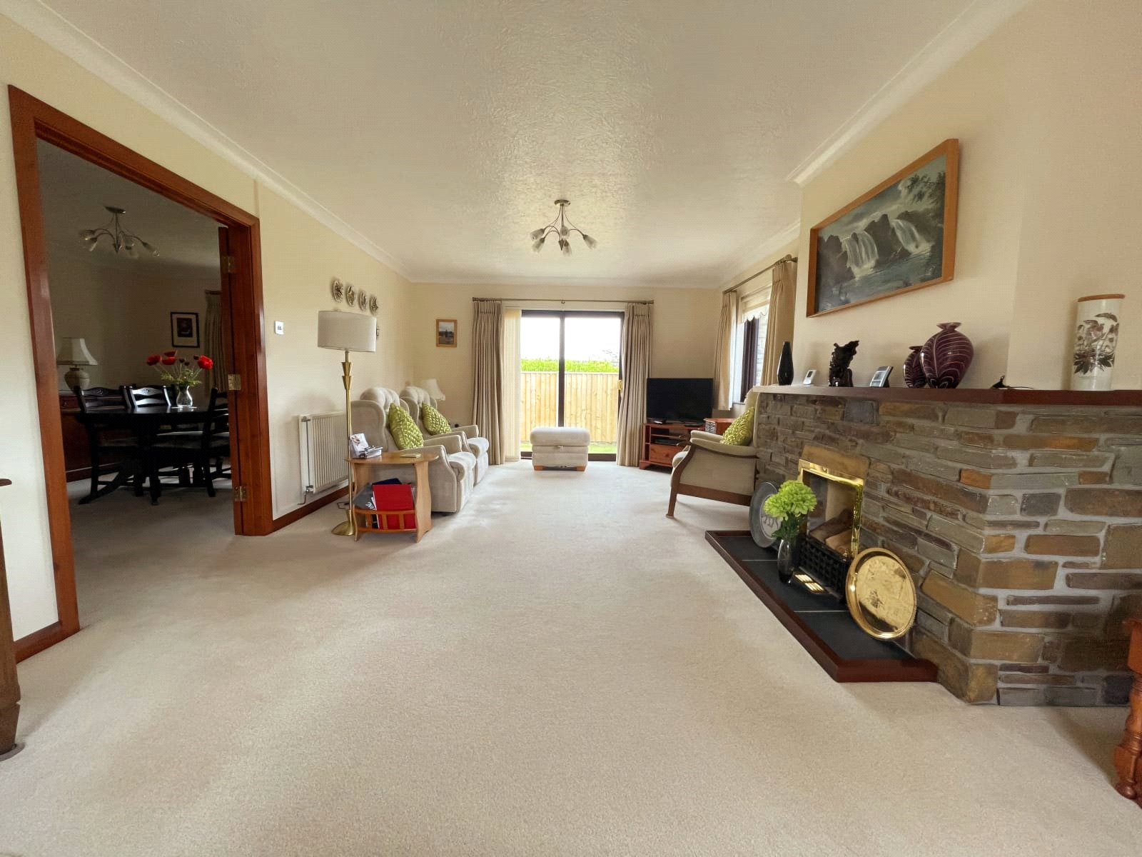 Carpet flooring,open fireplace with stone surround, radiator x2, double glazed, uPVC window x3 and patio door.