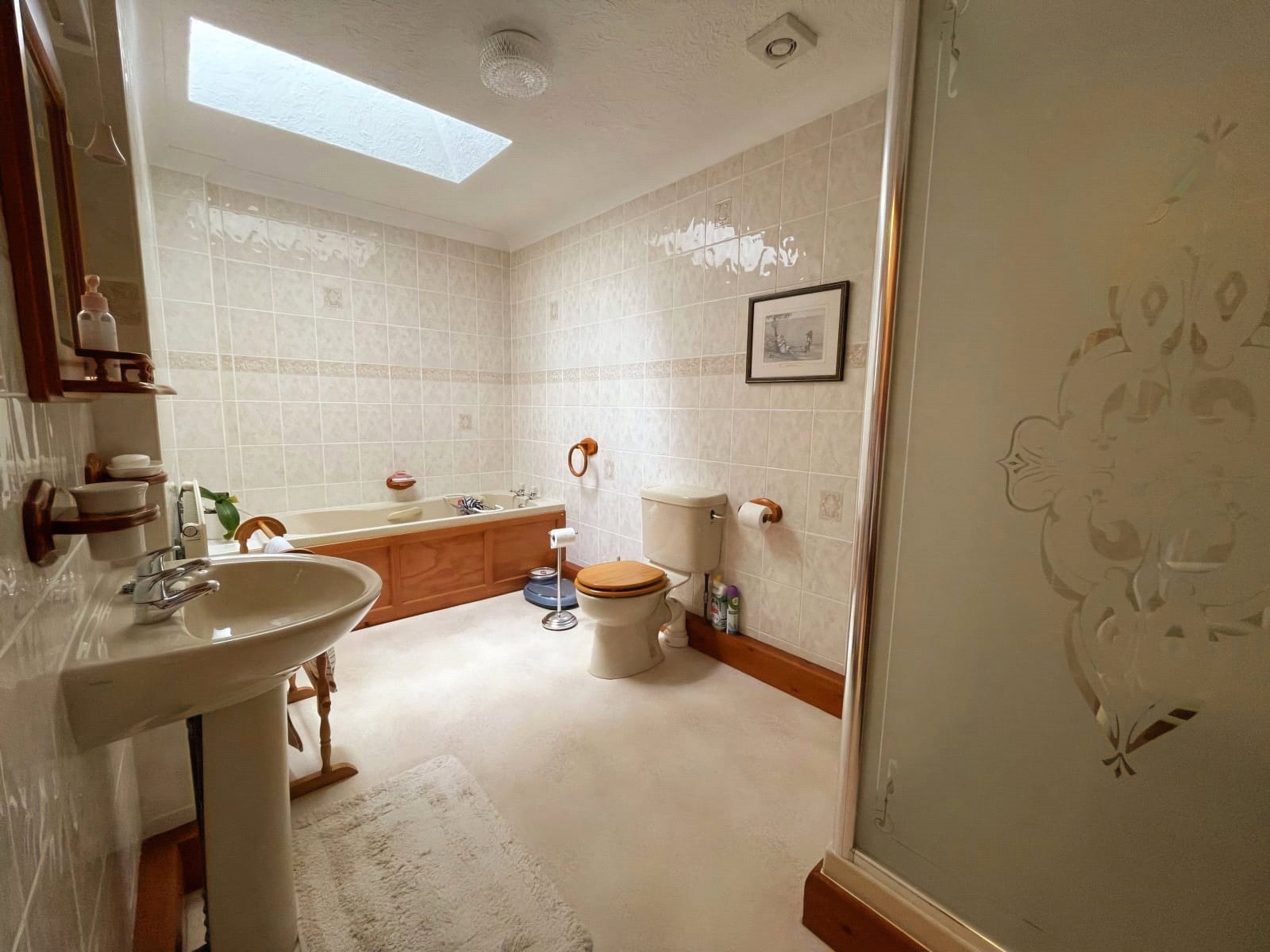 Vinyl flooring, shower, WC, wash hand basin, bath, fully tiled walls, Velux window, radiator.