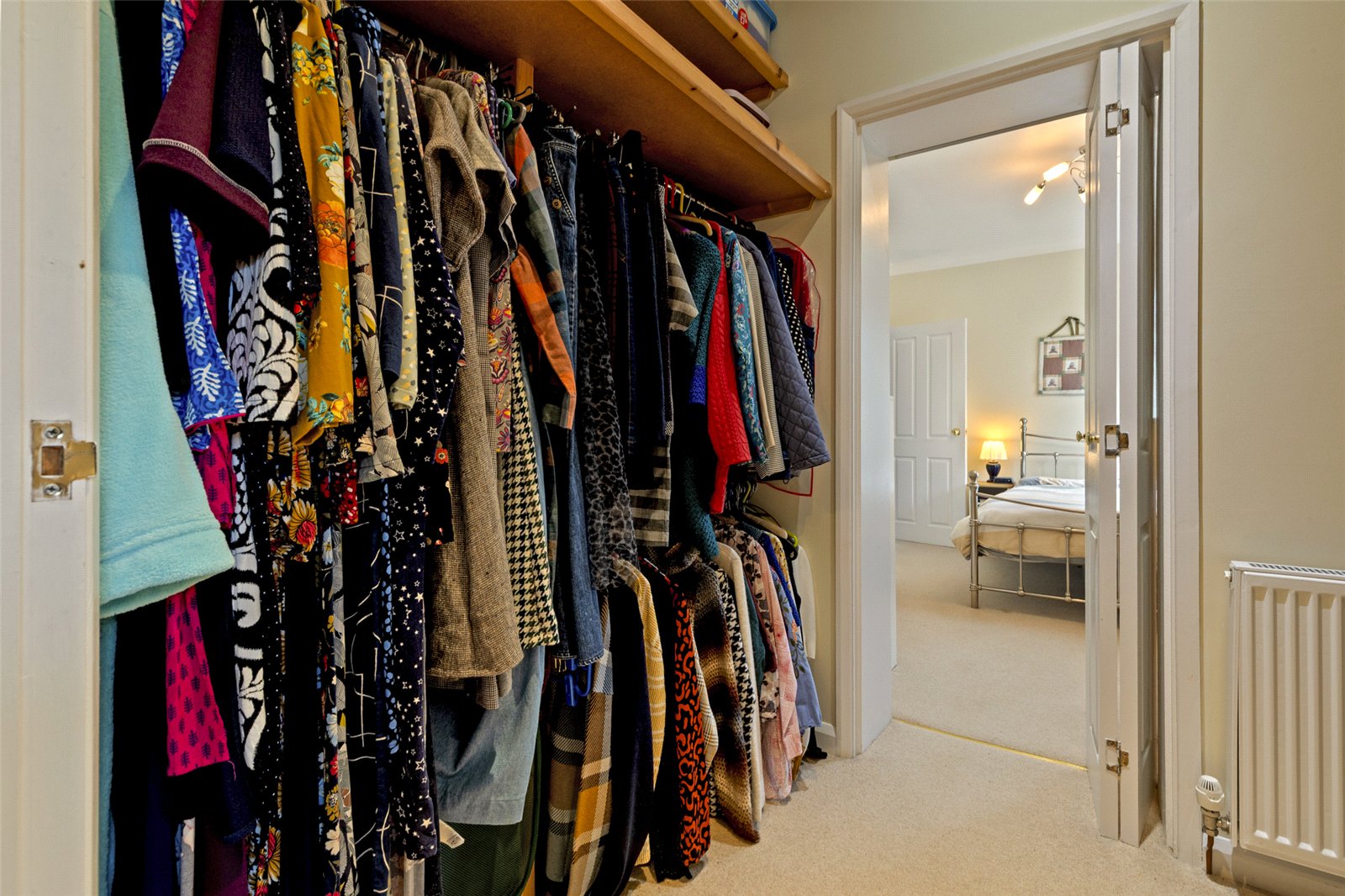 A generously sized double bedroom with garden views, offering a calm and comfortable retreat with soft neutral décor and plush carpeting. The layout flows into a well-designed walk-in wardrobe, providing excellent storage with open rails and shelving. The adjoinuing bathroom en suite combines style and practicality, ideal for relaxed everyday living.