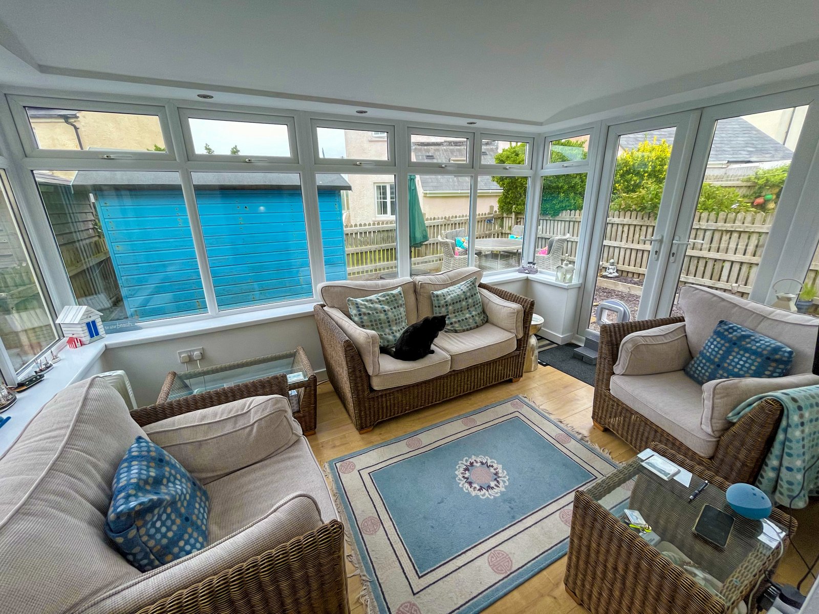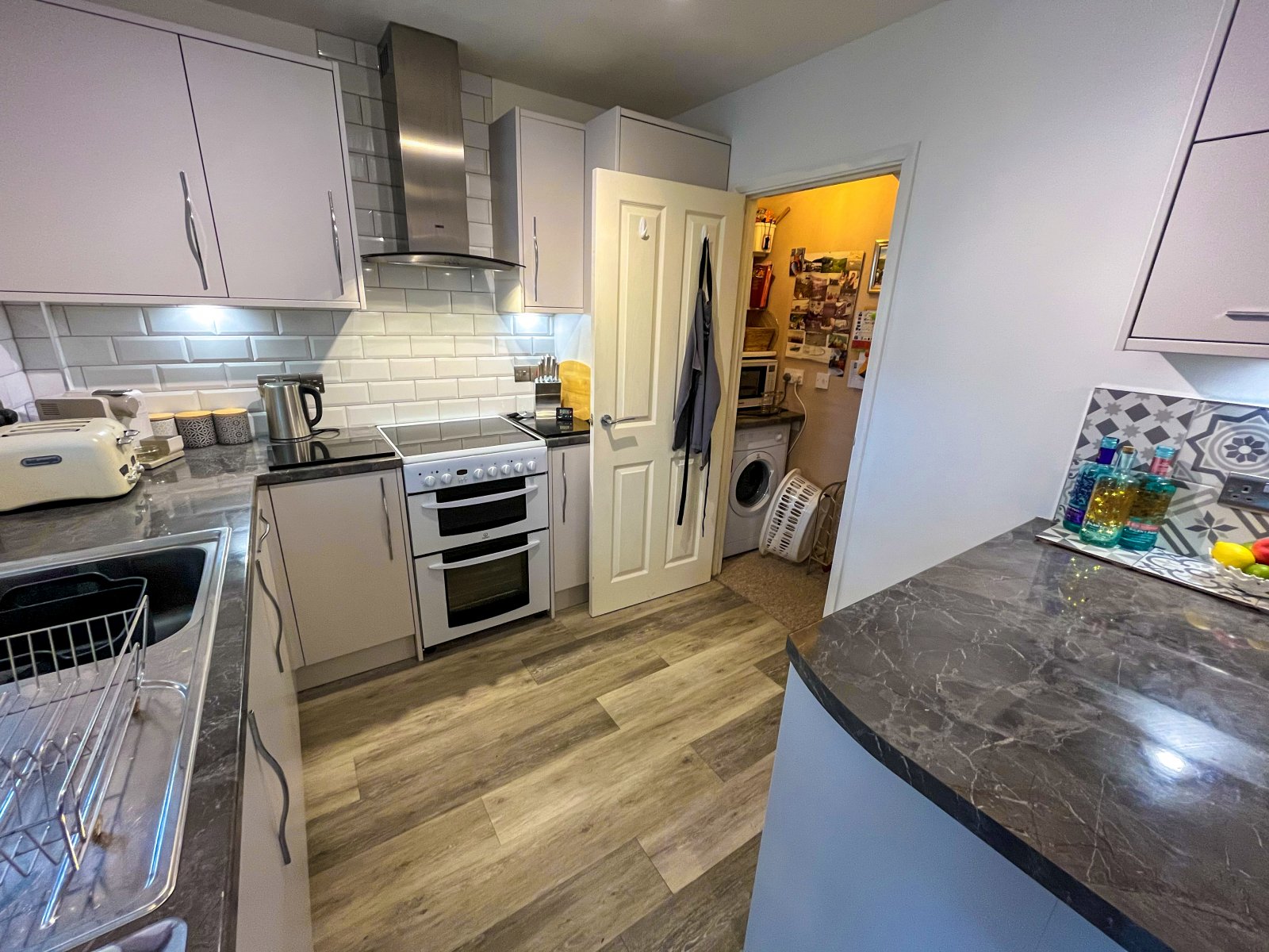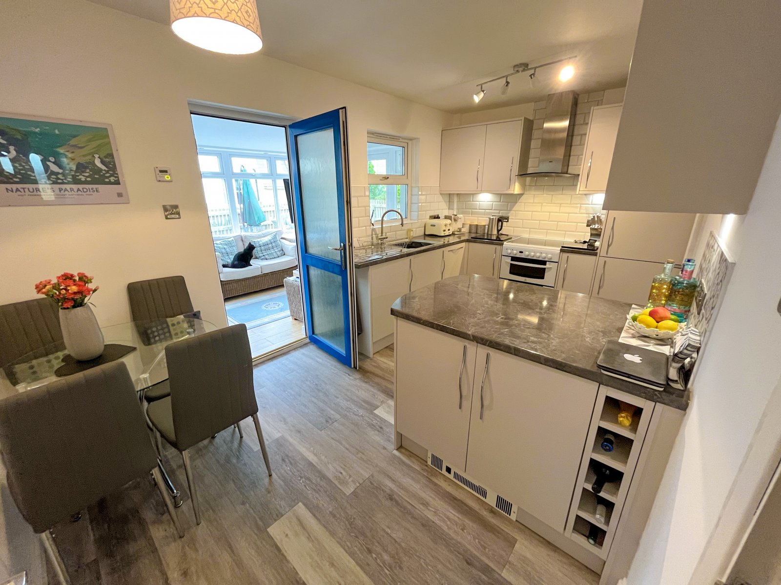 Range of base and wall units, integrated fridge/freezer, washing machine, dishwasher, electric oven, electric hob and extractor fan with lighting above, undercupboard lighting, stainless steel sink with mixer tap and hosepipe function, peninsula worktop, pull-out bin store, light fitting and spotlighting, uPVC double glazed window, under counter heat fan, access to utility cupboard and sun room.