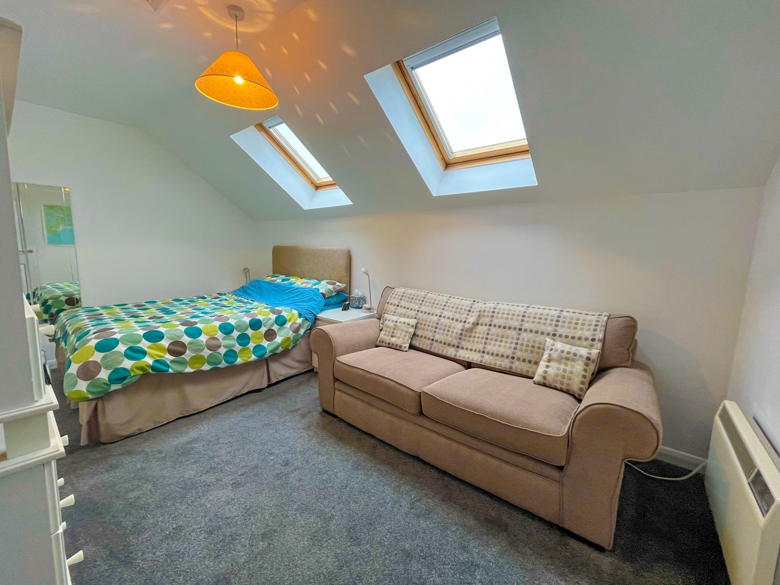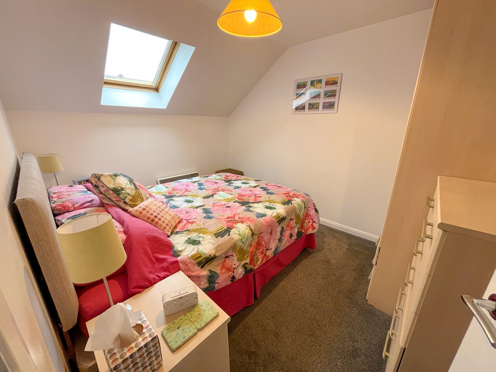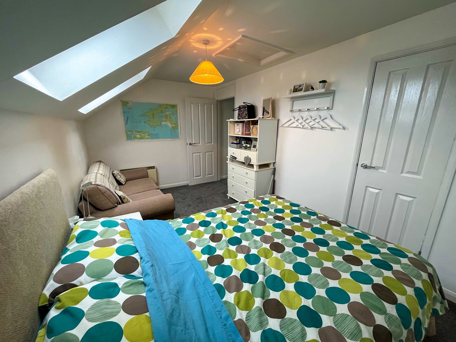 Sizeable double bedroom with 2 x rear-facing Velux skylight double glazed windows, carpeted floor, light fitting, electric radiator and recessed storage closet.