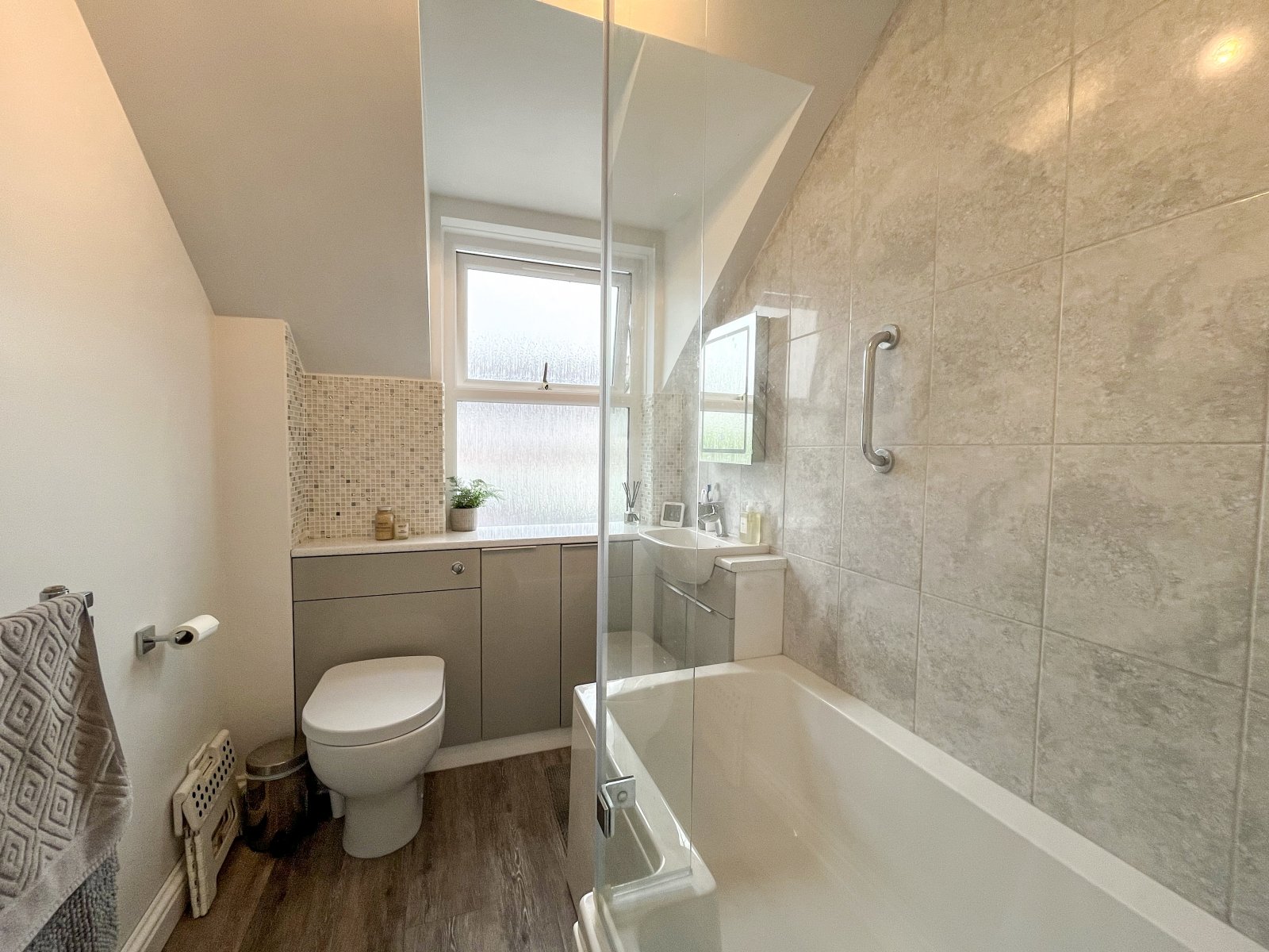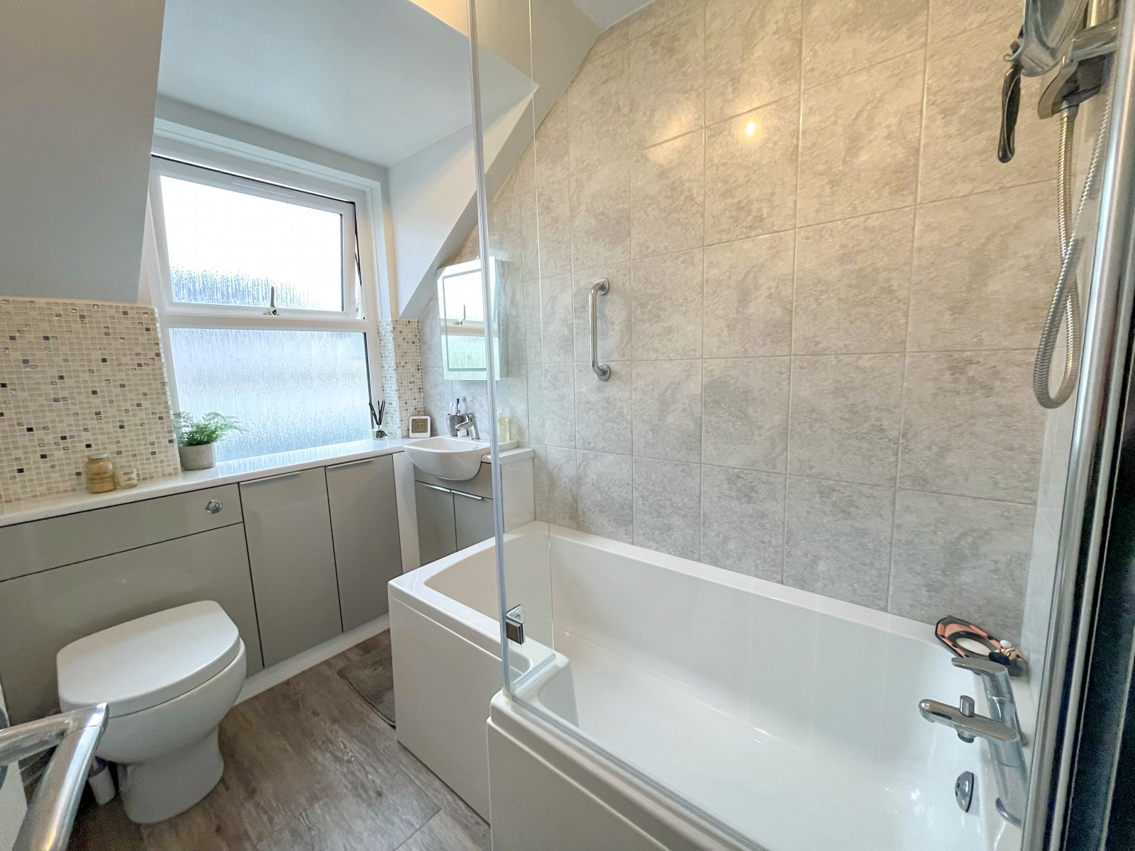 Modern bathroom suite, comprising of laminate flooring, WC, L-shaped bath with mixer tap and shower hose connector and with electric shower over, wash hand basin with mixer tap and vanity unit under and light-up mirror over, uPVC double glazed window with obscure glass, ceiling light and extractor, double width electric heated towel rail.