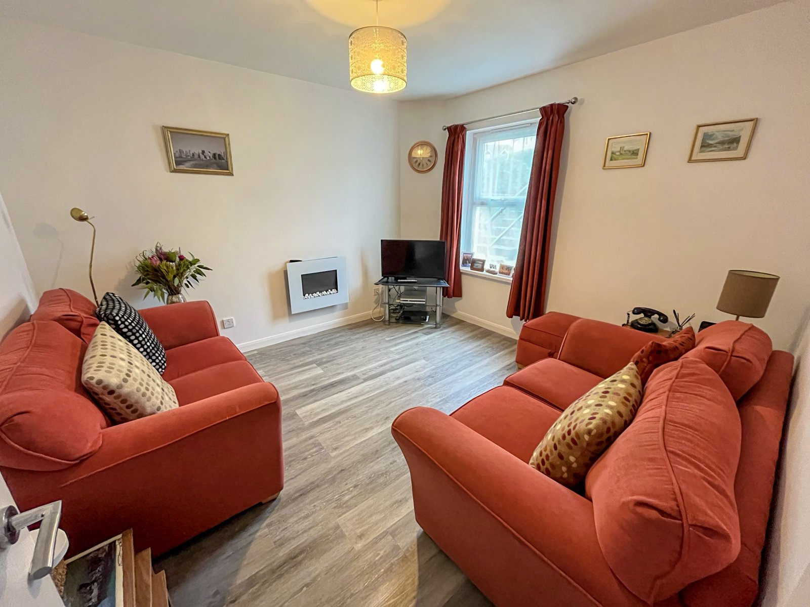 Front-facing lounge, with laminate floor, uPVC double glazed windows, electric heater with remote control, and light fitting.