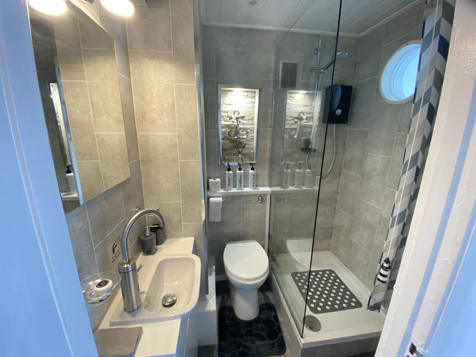 Modern fitted shower room with WC, WHB,Shower,tile flooring.