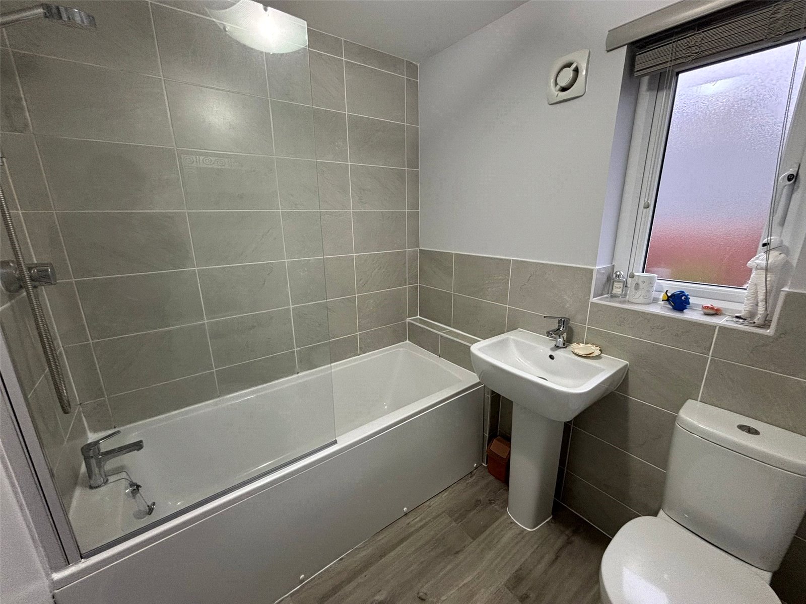 Wood effect laminate flooring, double glazed windows, sink, toilet, bath with overhead shower, tiled walls.