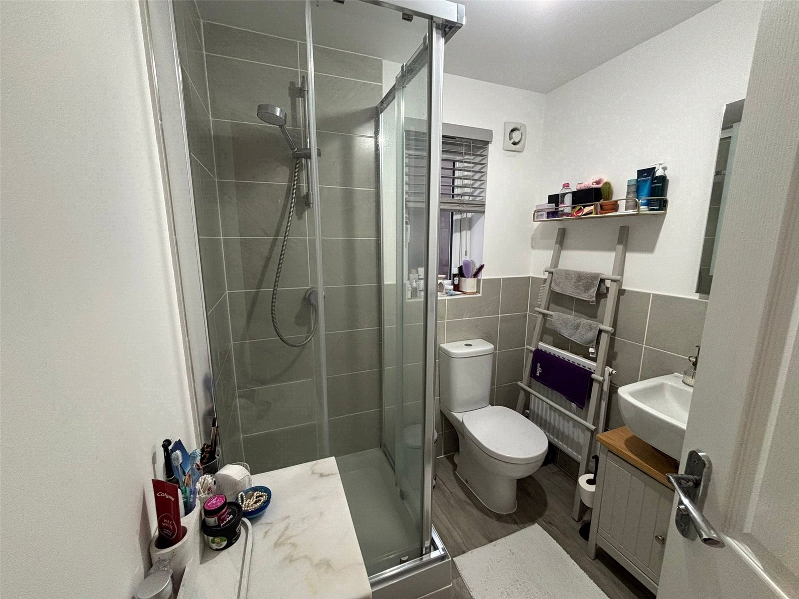 Wood effect laminate flooring, double glazed window, gas radiator, tiled walls, shower, sink, toilet.