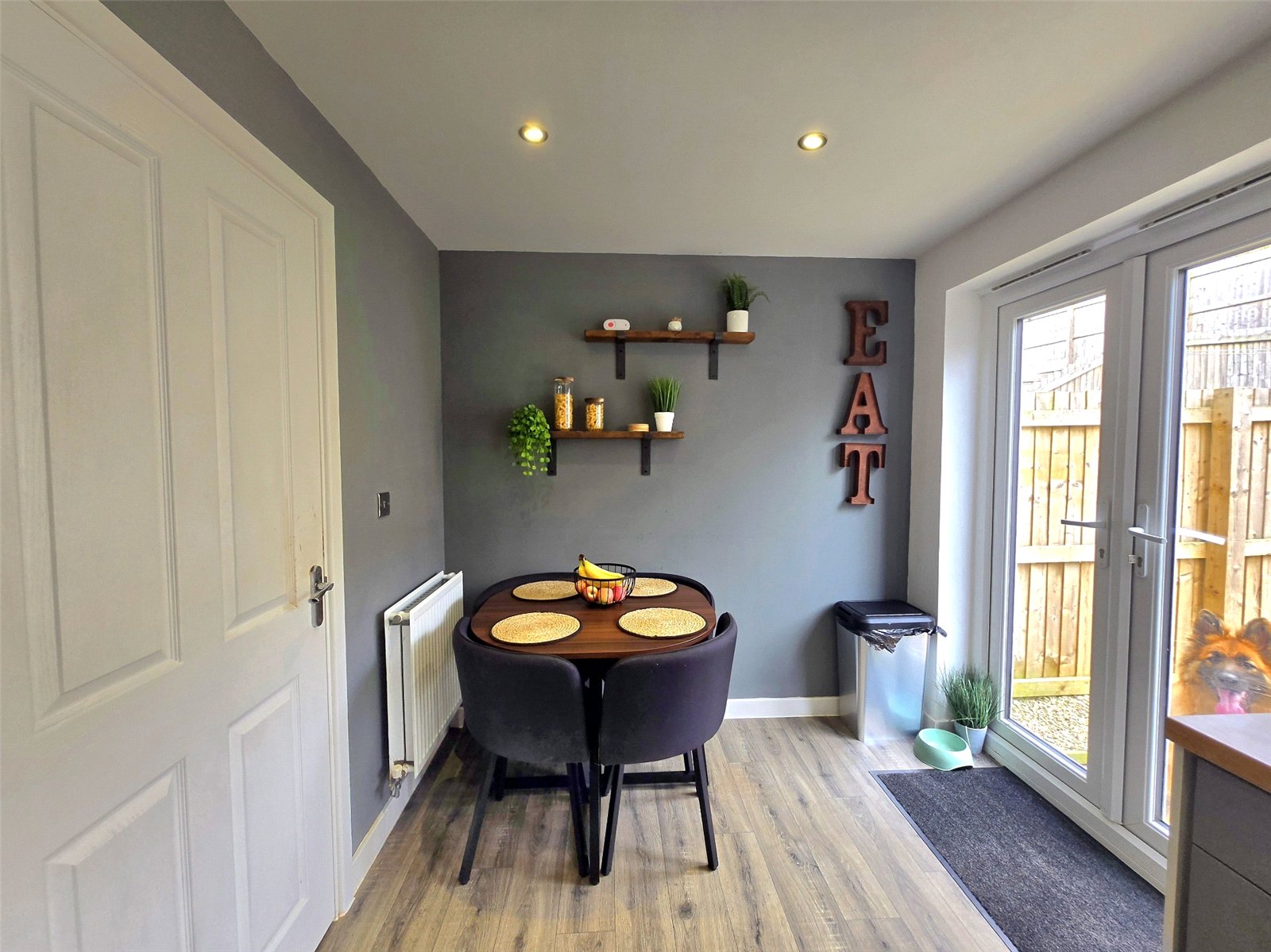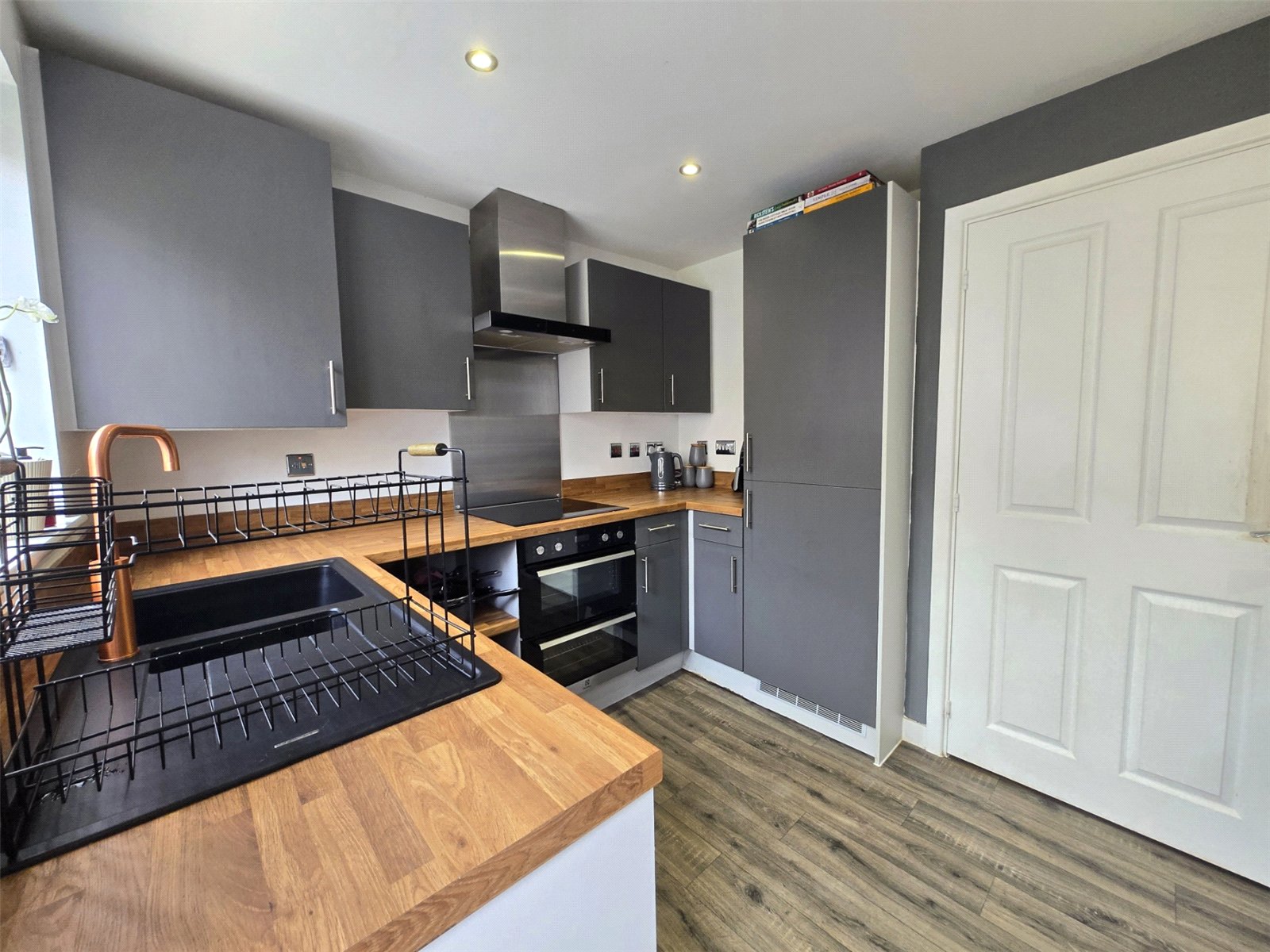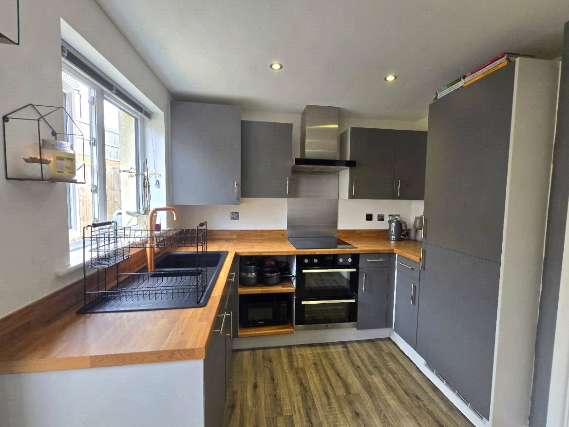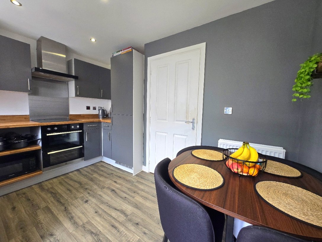 This modern kitchen features stylish laminate flooring and ample storage throughout, making it as practical as it is attractive. Recessed spotlights in the ceiling create a bright and contemporary feel. A handy corner space currently accommodates a small table, offering flexibility for dining or additional storage. The rear entrance opens directly onto the garden, blending indoor and outdoor living with ease.