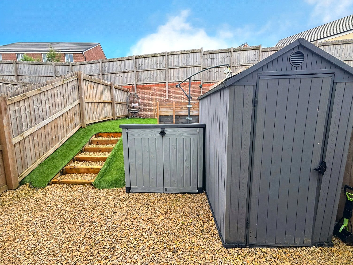 This low-maintenance, tiered garden offers a versatile and well-utilised outdoor space ideal for families or entertaining. The lower level features decorative gravel for easy upkeep, along with two high-quality outdoor storage sheds. Wooden steps lead to the upper level, laid with artificial turf for year-round greenery and minimal maintenance.