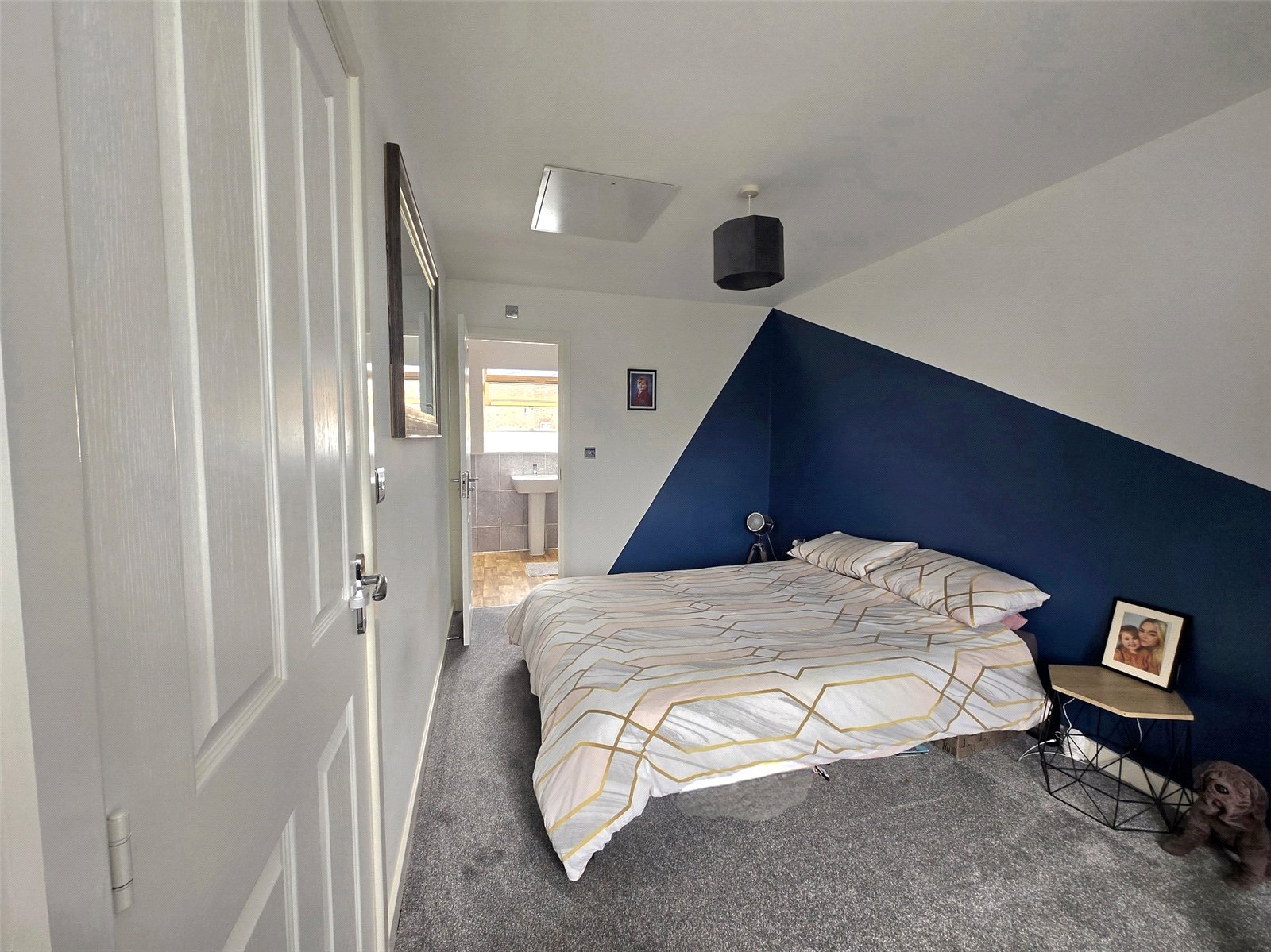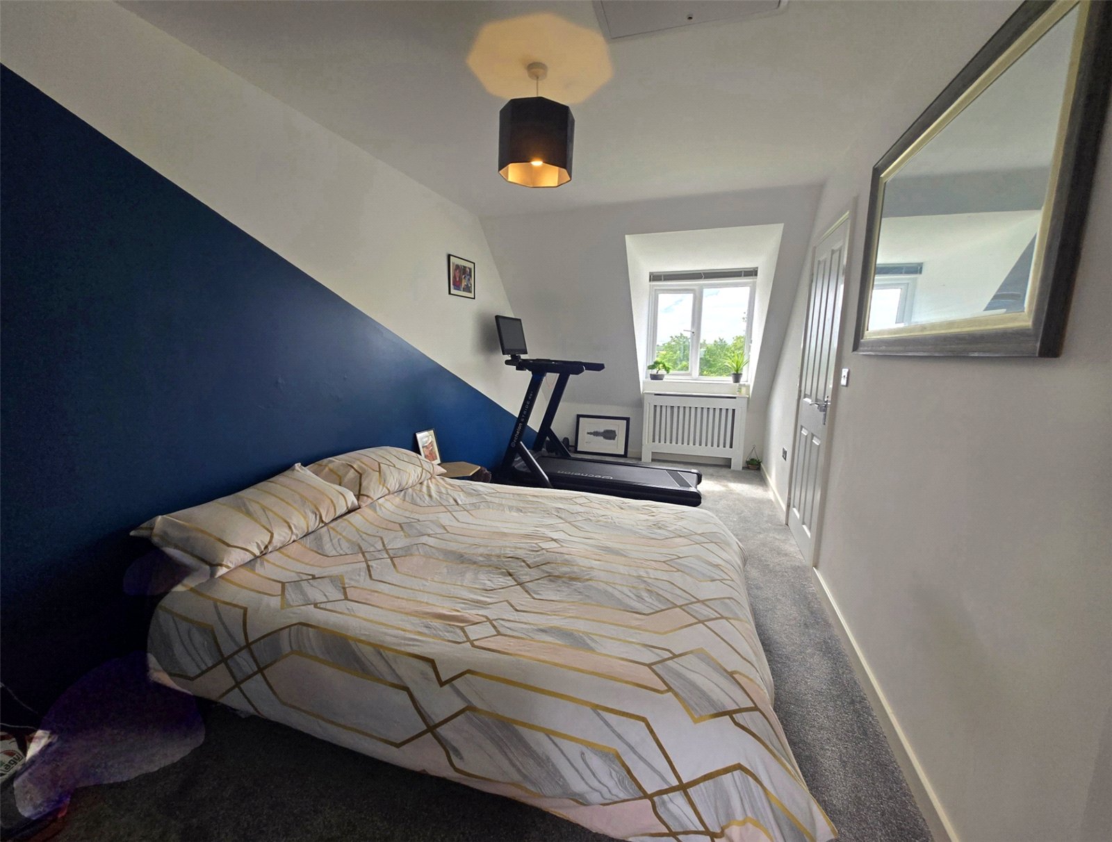 A bright and spacious master bedroom positioned on the top floor, complete with a modern en suite and a sunlit, south-facing window. The presence of a treadmill within the room underlines the generous floor space, perfect for a fitness area, dressing space, or additional furnishings.