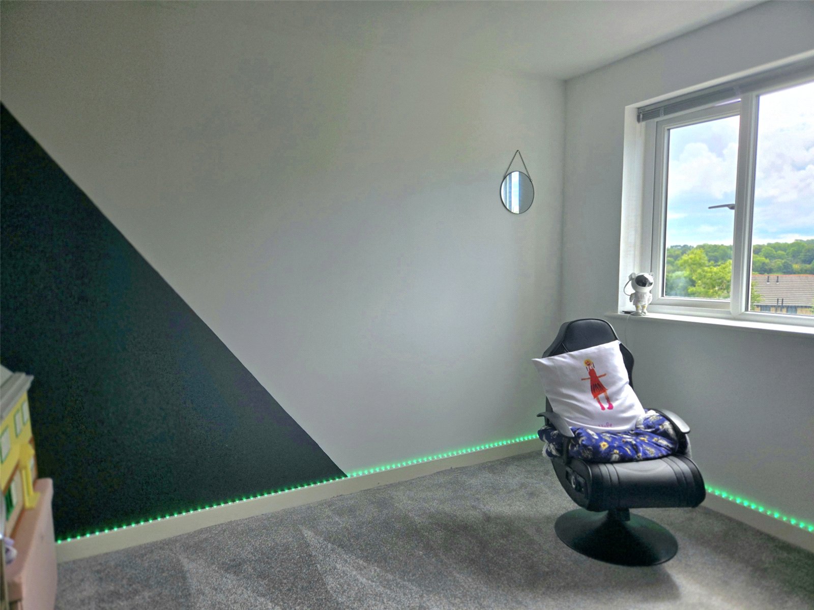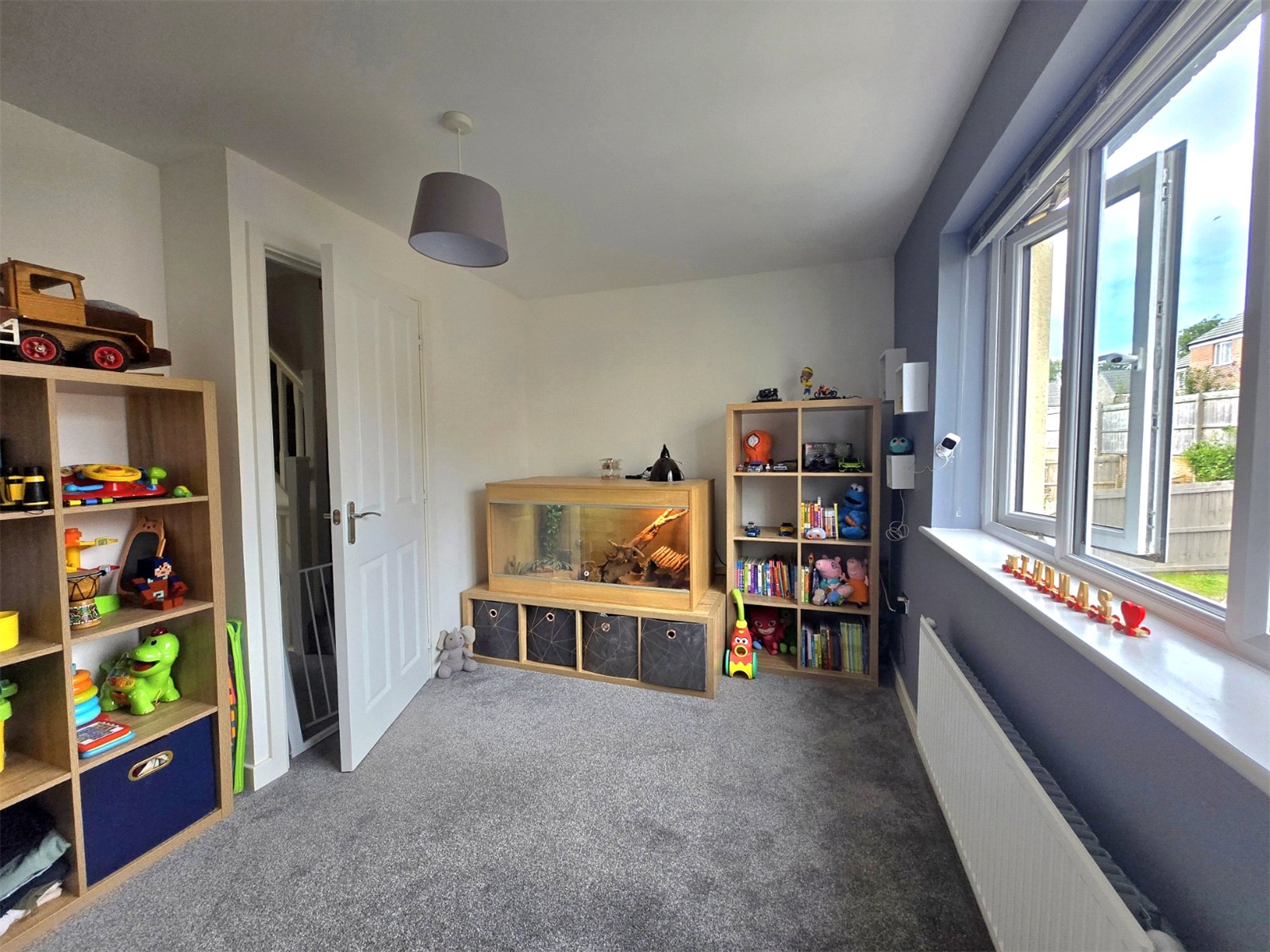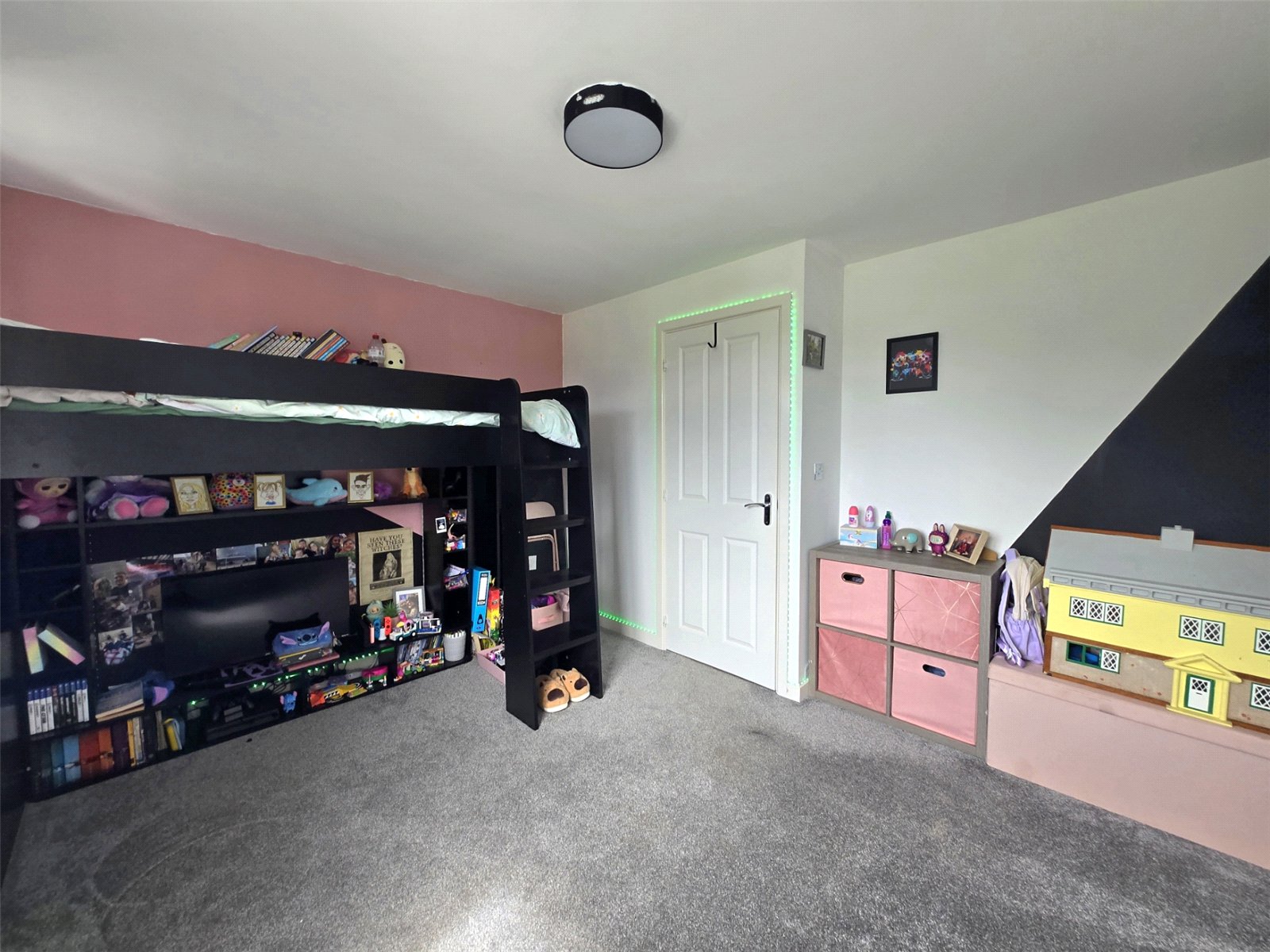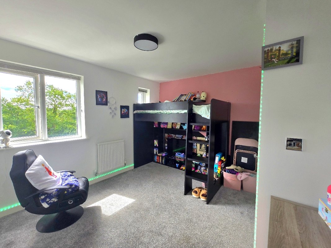 This well-sized bedroom features a large north-facing window that provides consistent, gentle lighting. With ample space—evident from the numerous bookshelves currently in place—it offers flexibility for various uses. Situated just off the landing and near the family bathroom for added convenience.