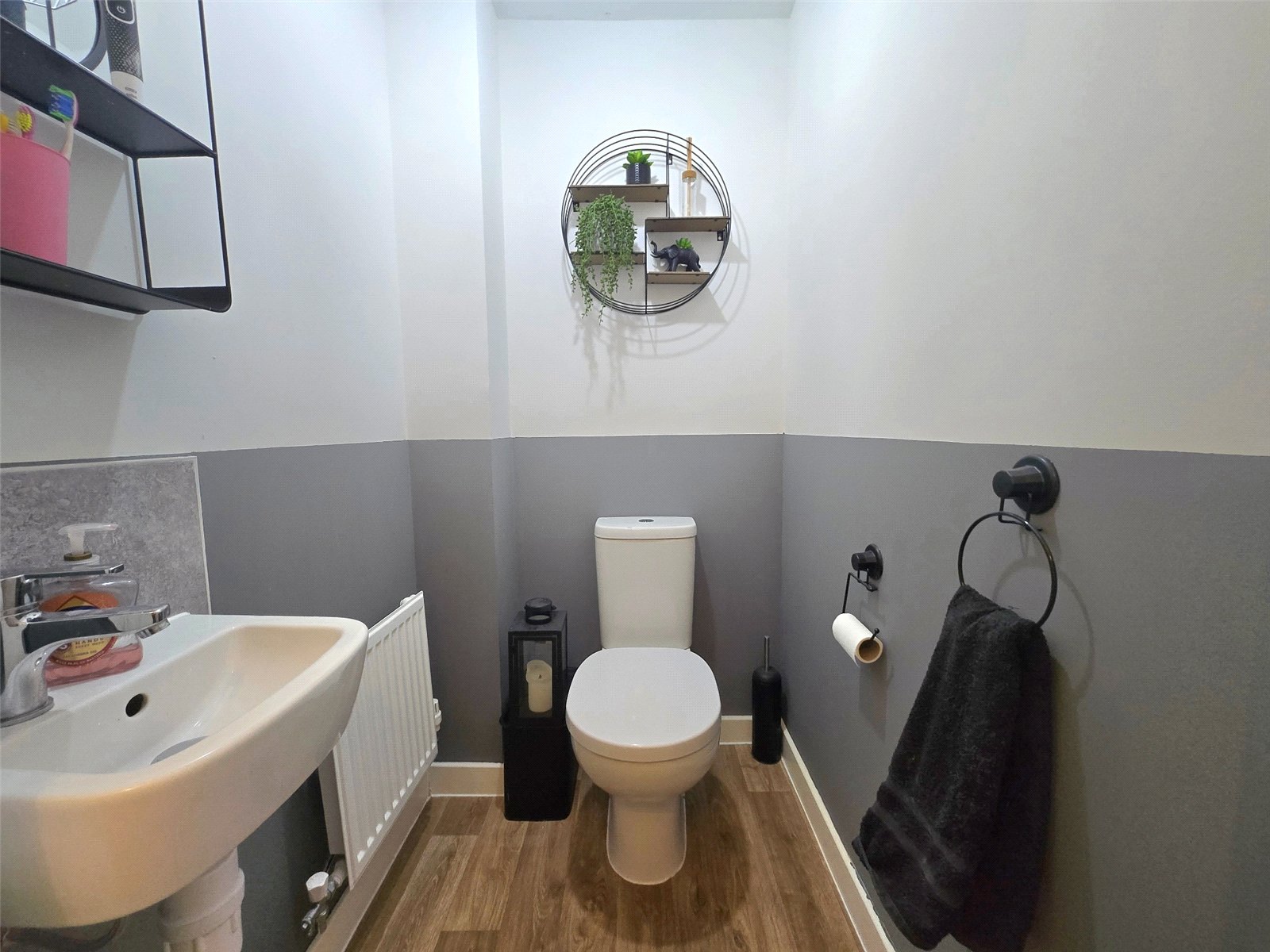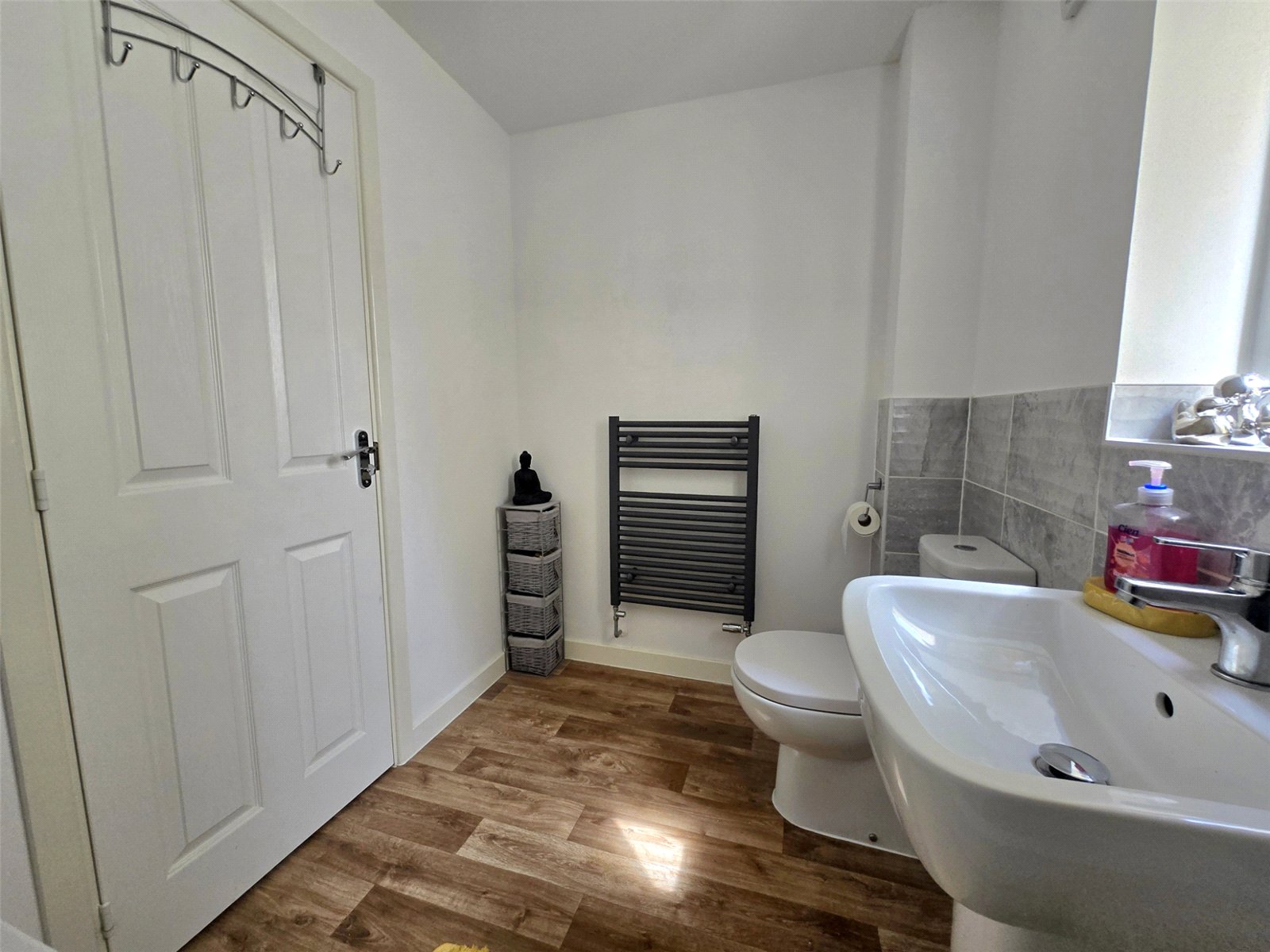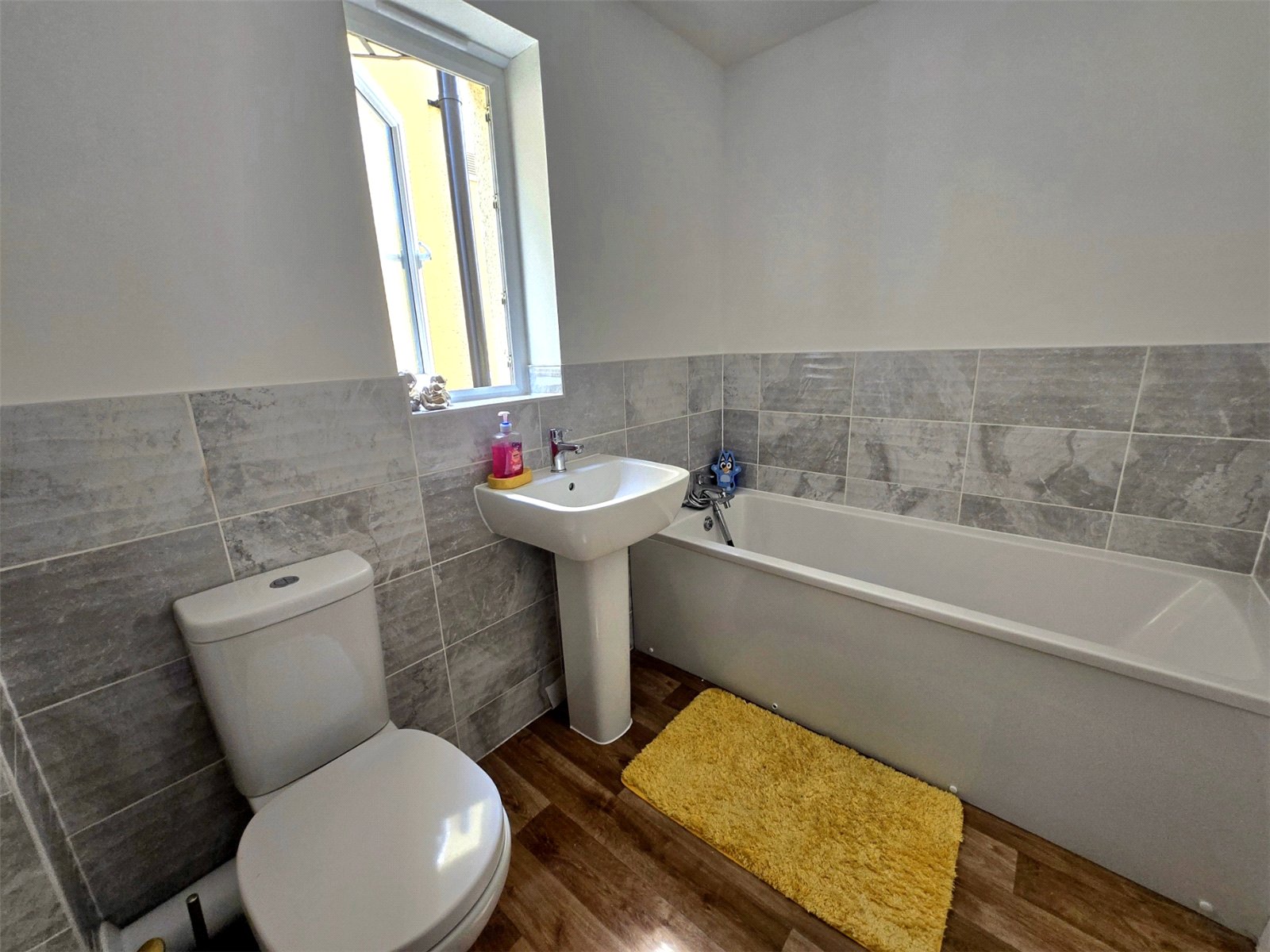 This first-floor family bathroom is compact in size but high in style. It features a toilet, sink, and bath, with high-quality finishes throughout. Carefully positioned lighting ensures a bright and inviting atmosphere and an obscure glass window letting in natural light.
